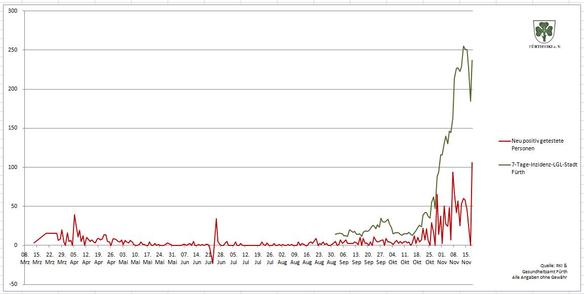 - Das Diagramm setzt sich aus den Daten des Gesundheitsamtes Fürth und den Zahlen des RKI zusammen.