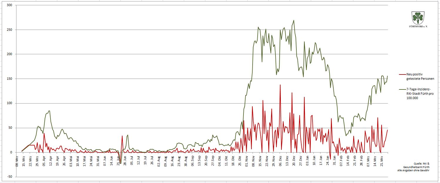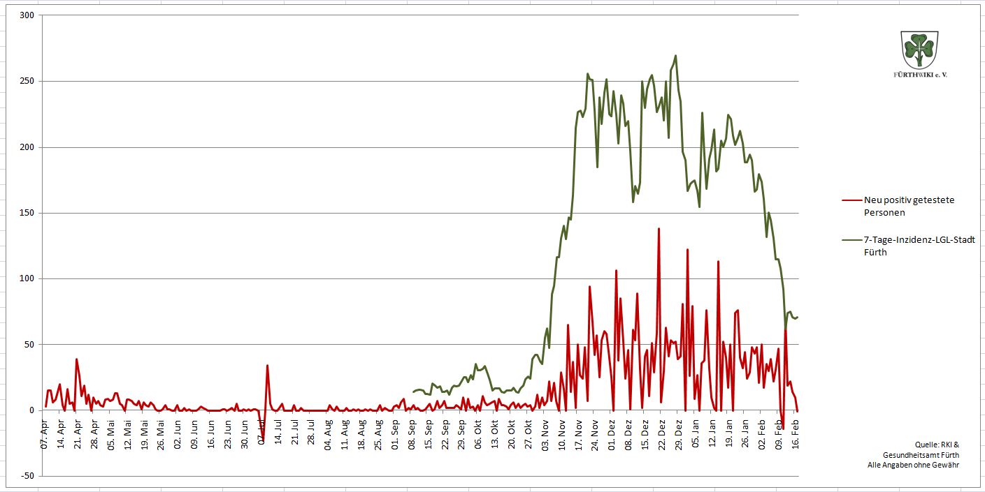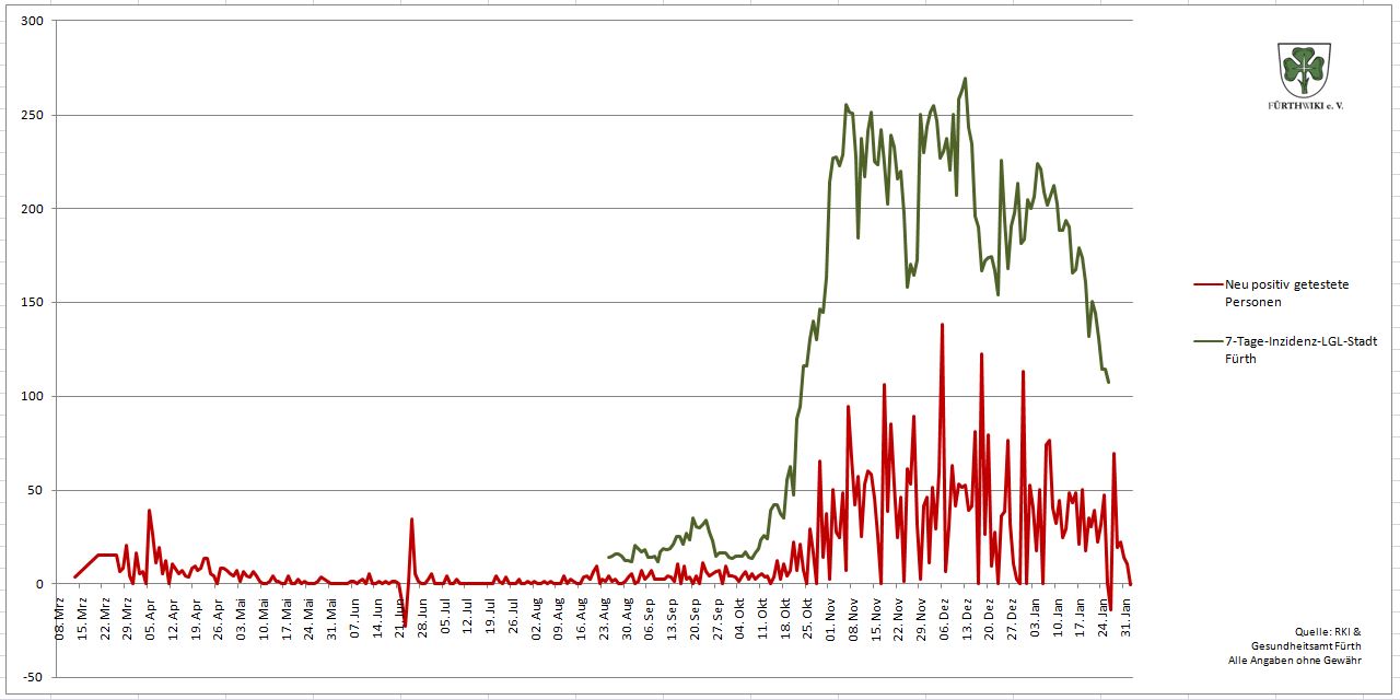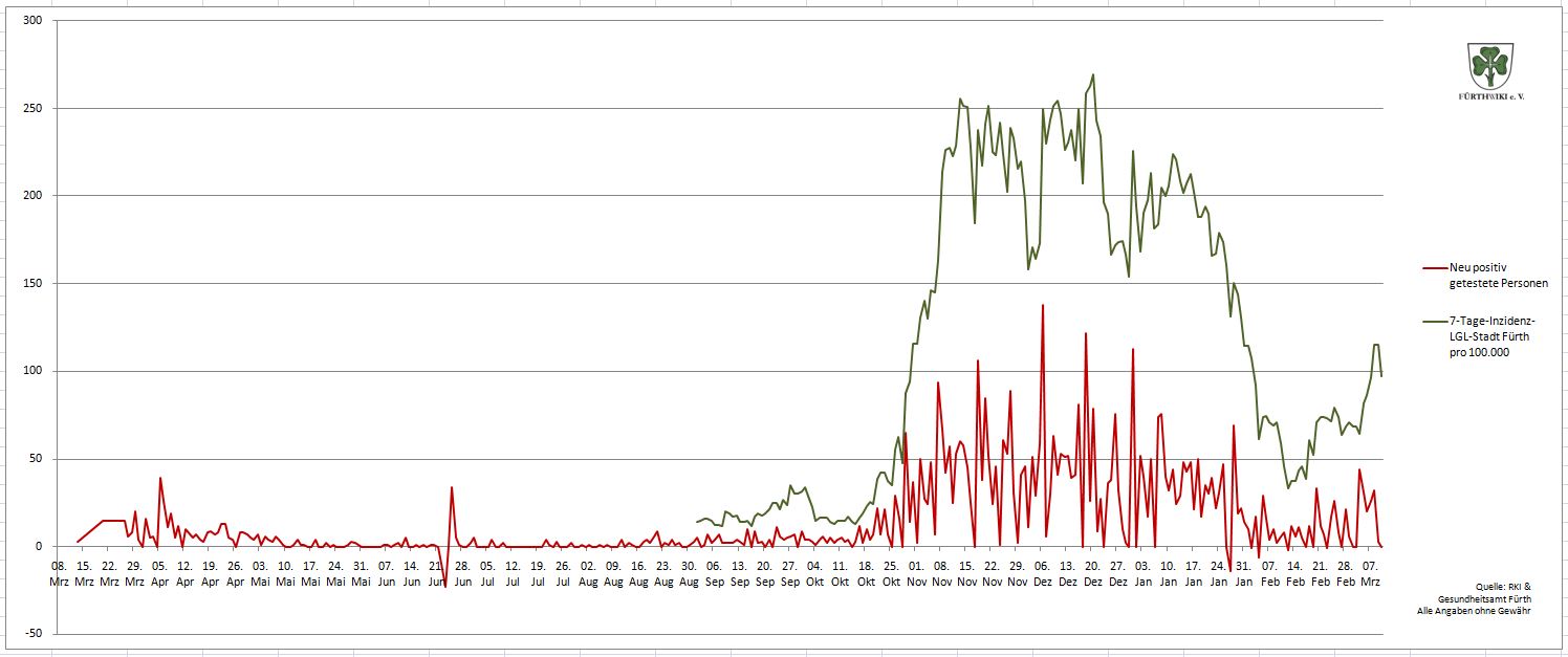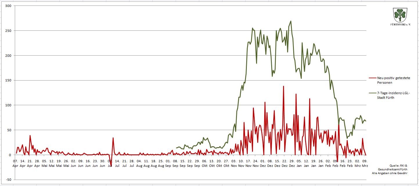 - Das Diagramm setzt sich aus den Daten des Gesundheitsamtes Fürth und den Zahlen des RKI zusammen.