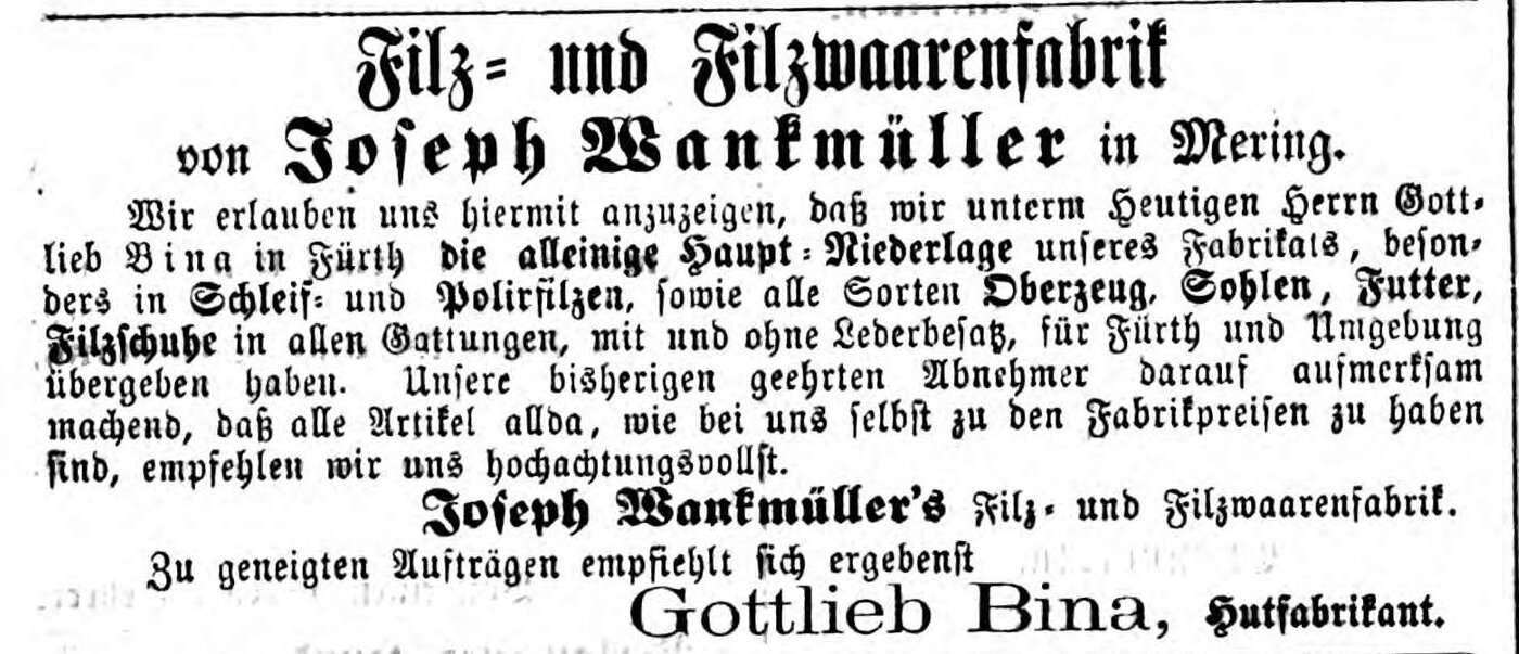 - (Herunterladen) 11 Anzeige Filzwaren, Gottlieb Bina, Ftgbl. 24.7.1863.jpg . . 1.400 × 603 . . 207 KB . . Chrischmi . . 17:32, 6. Jul. 2021