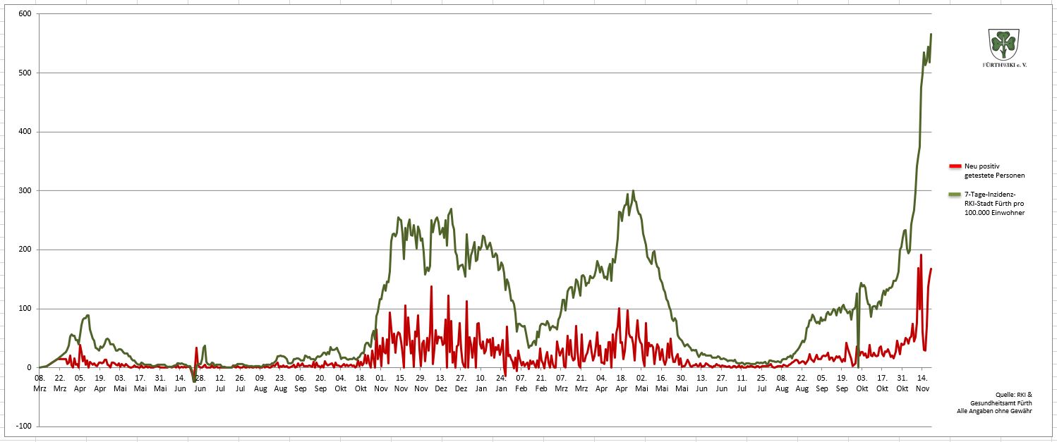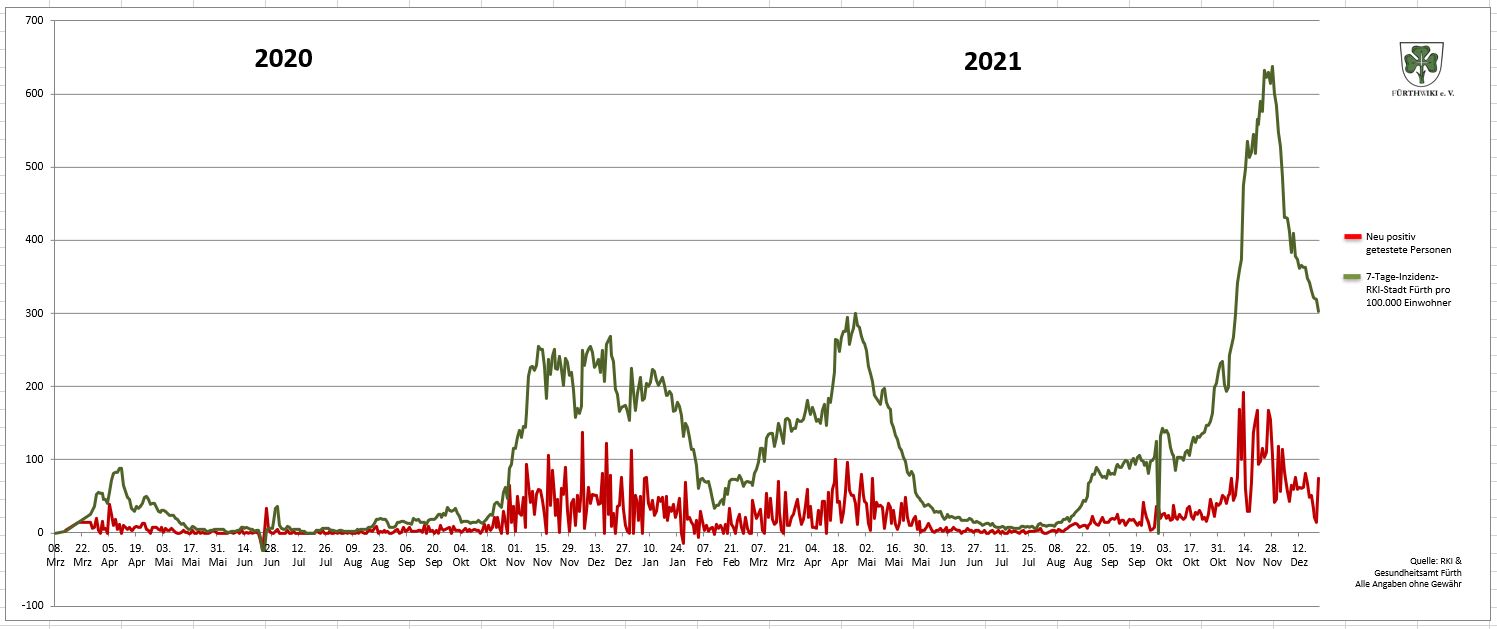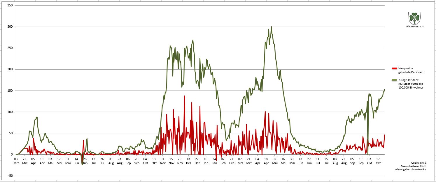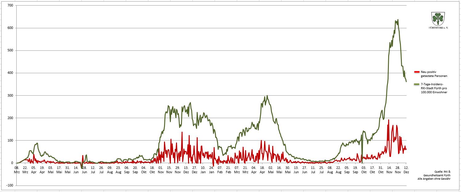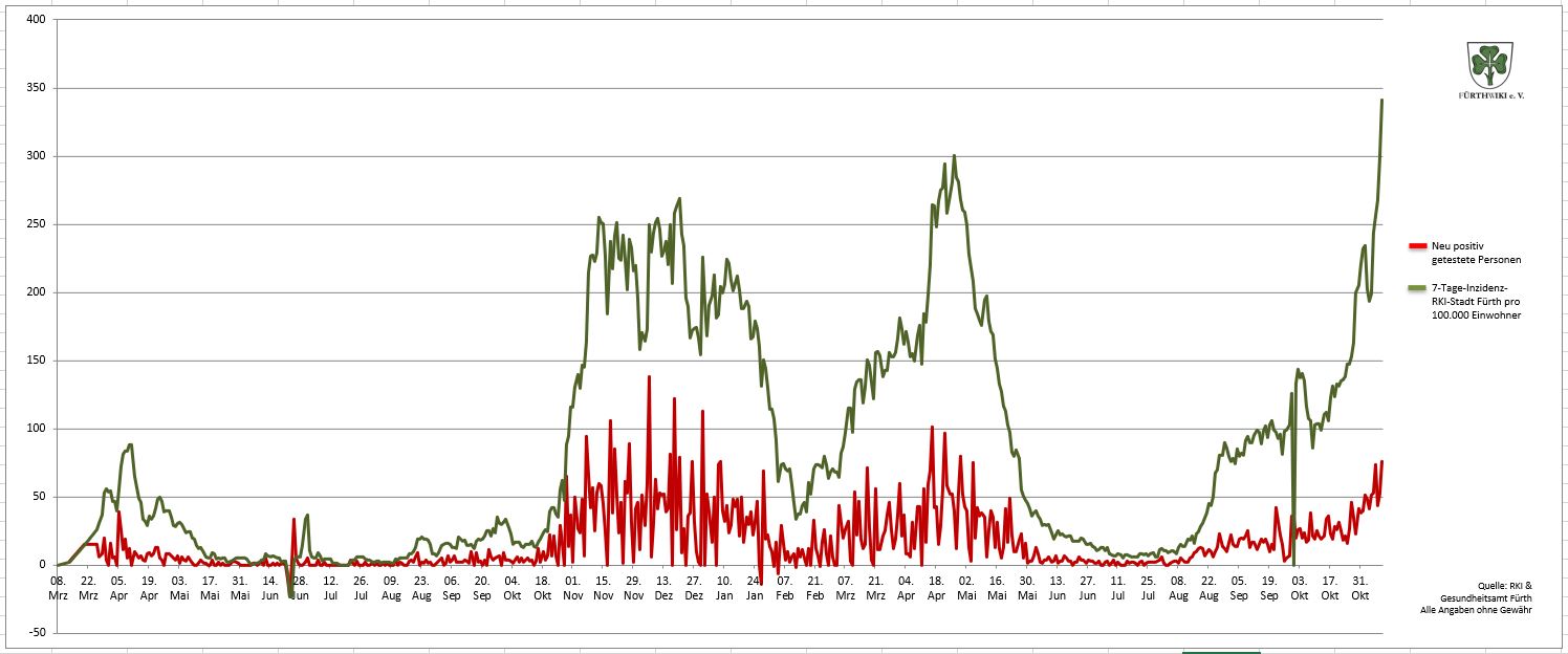 - Das Diagramm setzt sich aus den Daten des Gesundheitsamtes Fürth und den Zahlen des RKI zusammen.