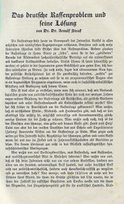 Bereits 1901 erschien zum ersten Mal das sog. "goldene Frauenbuch" als universelles Nachschlagewerk mit umfassendem Rat in allen Alltagfragen des weiblichen Lebens: Körper, Geist, Lebensweise, Ernährung, Gesundheit, Hygiene, Ehe, Kinder und Moral. Ebenfalls behandelt wurden in dem Nachschlagewerk Tabuthemen wie Masturbation, Homosexualität, Ehebruch oder Verhütung. Das "Frauenbuch" erlangte bereits 1913 eine Millionen-Auflage und war somit auch für den Nationalsozialismus von großem Interesse, denn hier konnten sog. rassenhygienische Fragen im Sinne der völkischen Ausprägung einfach erläutert und verbreitet werden. 1941 erschien die "Neue Drei-Millionen-Ausgabe mit Einführung in die deutsche Rassenpflege", mit einem postumen Vorwort von Dr. Dr. Arnulf Streck. Thema seines Vorwortes lautet: Das deutsche Rassenproblem und seine Lösung".[19] Nach mehreren hasserfüllten Seiten gegen alles Jüdische kommt Streck schließlich zu der Überzeugung, dass die sog. Rassenfrage der Schlüssel zur Weltgeschichte darstellt. In der Folge stellt Streck 10 Regeln auf, die alle zusammen nur ein Ziel verfolgen: die Auslöschung der "jüdischen Rasse" zugunsten der seiner Meinung nach stärkeren und besseren "deutschen Rasse". Das Buch erschien noch bis Ende der 1970er Jahre als Standardwerk für den häuslichen Gebrauch, wenn auch nach 1945 befreit von der fehlgeleiteten ideologischen Ausrichtung des Nationalsozialismus.
