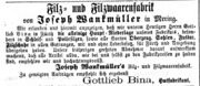 Zeitungsanzeige des Filzfabrikanten Gottlieb Bina, Dezember 1854 Lizenz: NoC-NC 1.0