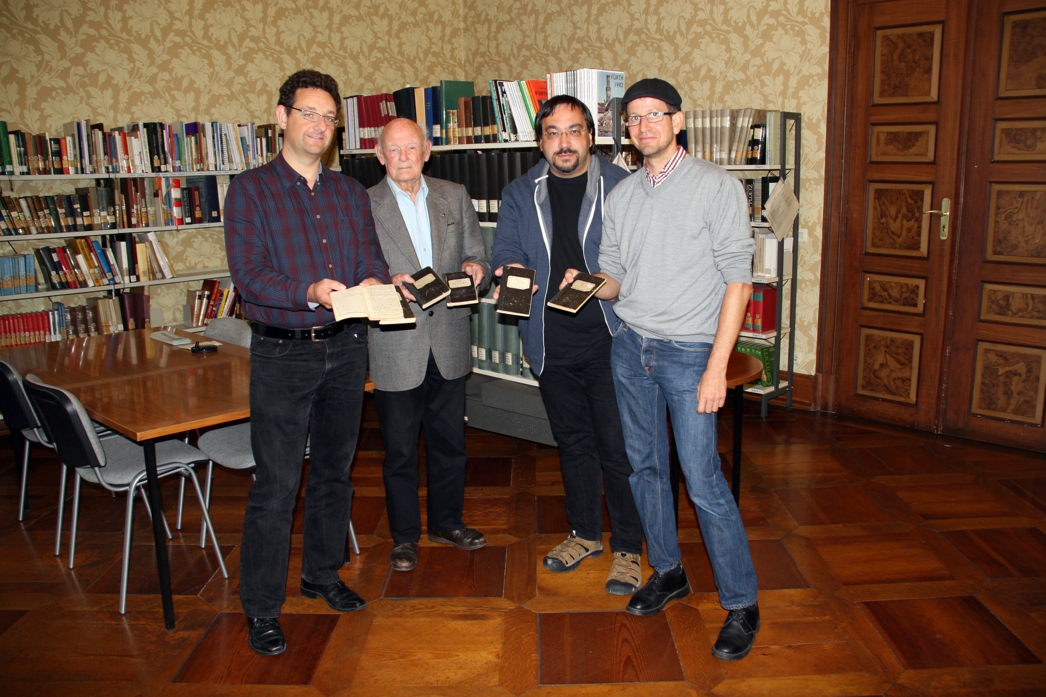 | Beschreibung | Übergabe der Tagebücher von Fritz Oerter an das Stadtarchiv Fürth – v. l. n. r.: Dr. Martin Schramm, Alfred Hierer (Enkel von F. Oerter), Kamran Salimi, Leo Seidl, August 2017 | ||