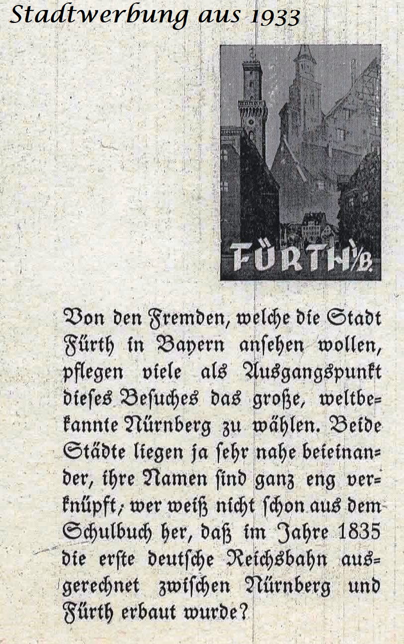 | Dateiinfo (Bild-Unterschrift und Info-Box, automatisch erstellt) | Werbung NS-Propaganda, 1933 Urheber: Stadt Fürth<br><br>Lizenz: Bildlizenz-Stadtarchiv | ||