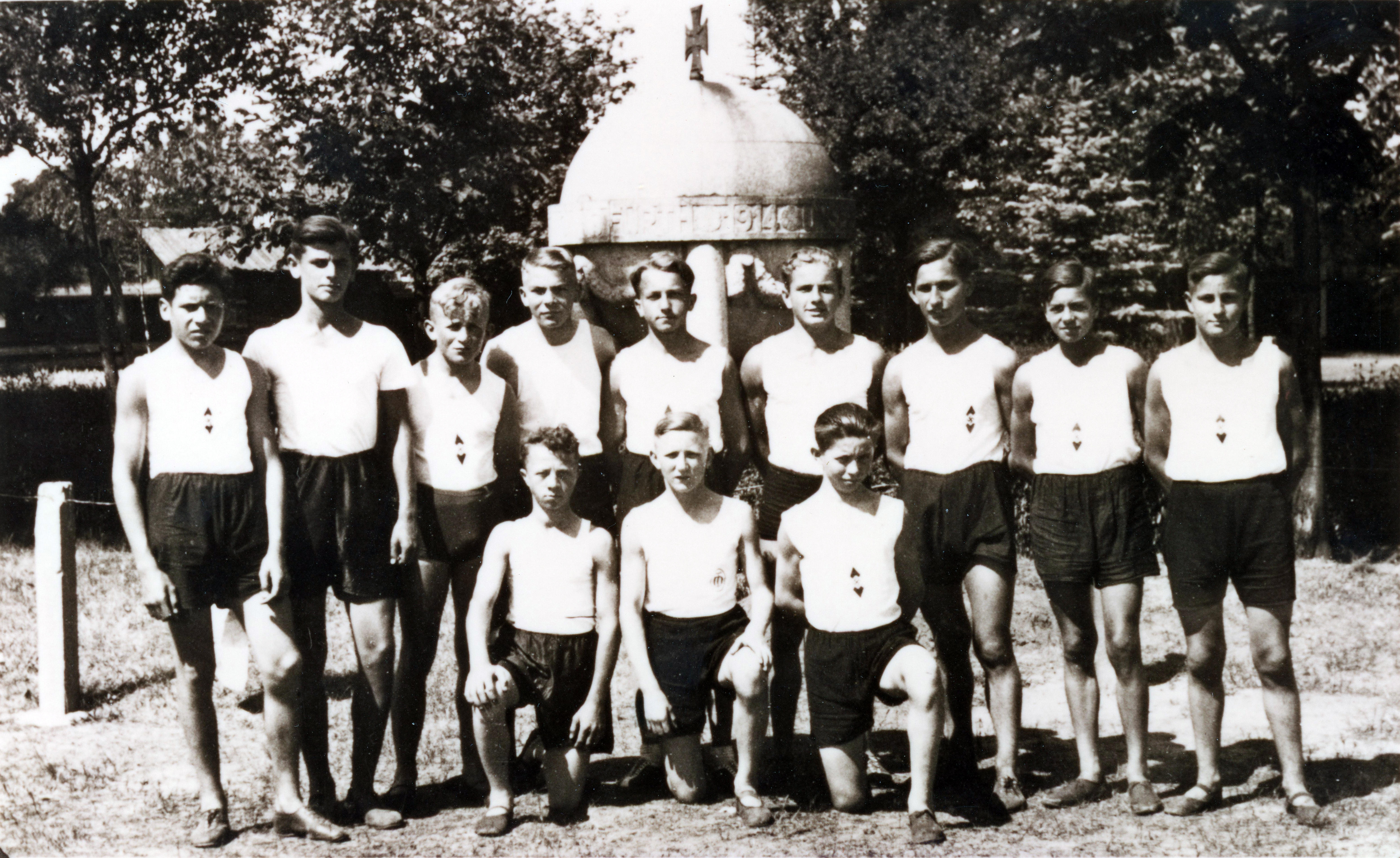 | Beschreibung | Turnermannschaft vor dem Kriegerdenkmal 1914/18 der Spielvereinigung am Laubenweg, ca. 1935 | ||