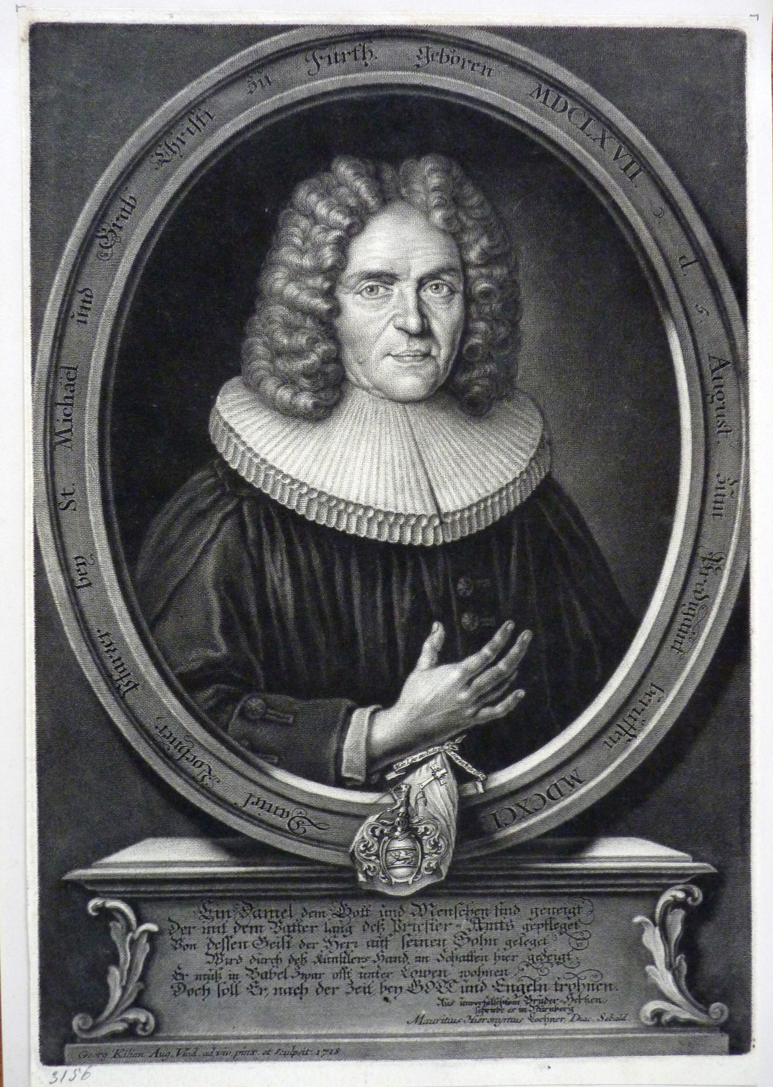 | Beschreibung | Daniel Lochner d. Ä. - Schabkunst von Georg Kilian 1718 mit einem Epigramm des Bruders Mauritius Hieronymus Lochner | ||
