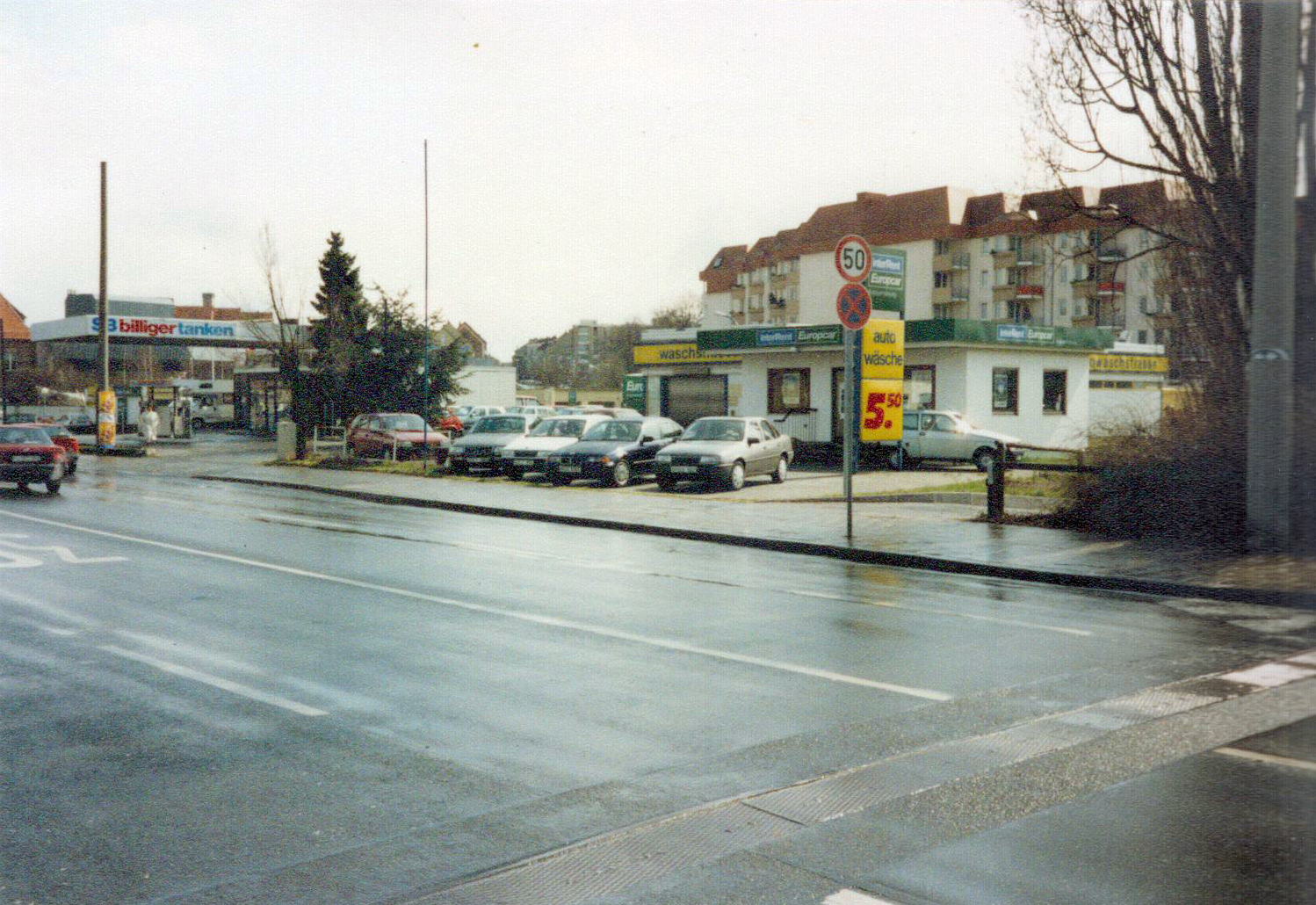 | Beschreibung | Die ehem. SB billiger Tankstelle mit Waschanlage, Europcar Autoverleih und Garagen - vor dem damals neu errichteten Seniorenwohnheim Kursana, März 1992 | ||