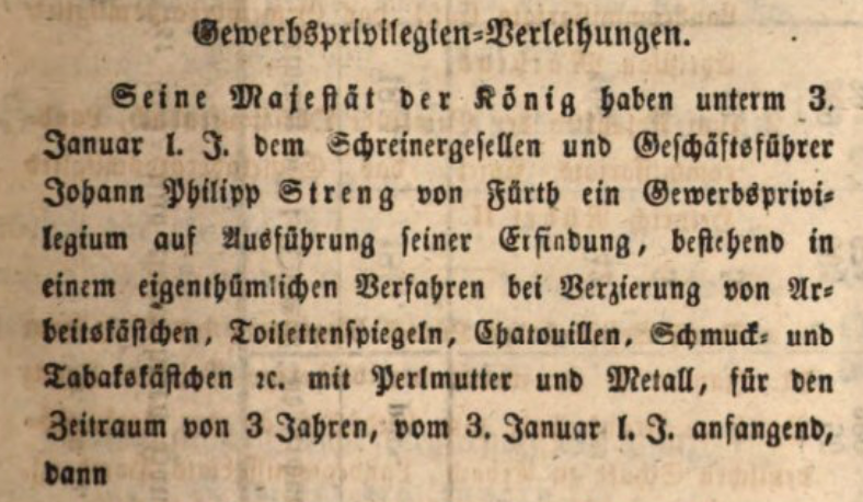 | Dateiinfo (Bild-Unterschrift und Info-Box, automatisch erstellt) | Erteilung eines Gewerbsprivilegs für Joh. Philipp Streng, Januar 1857 Lizenz: NoC-NC 1.0 | ||