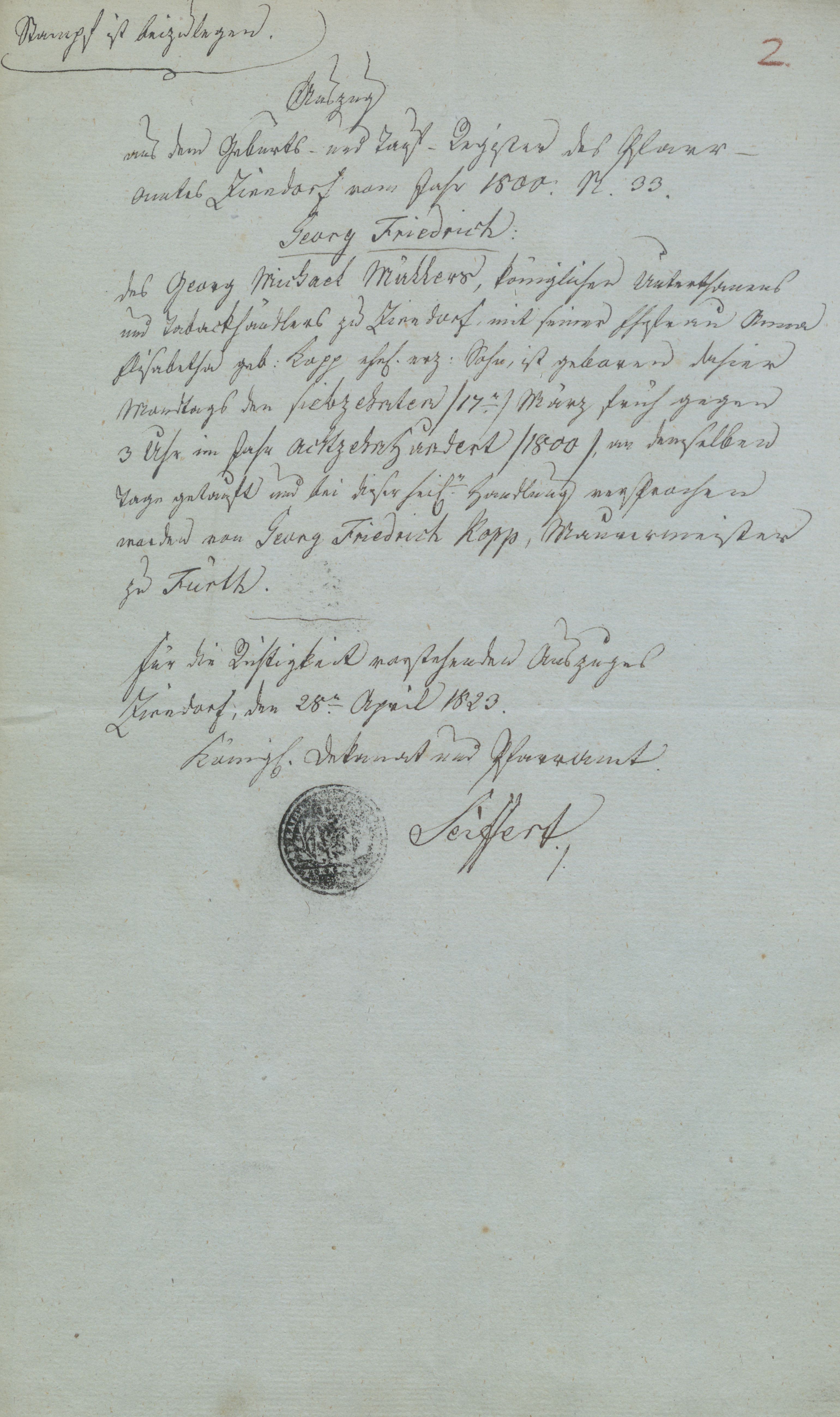 | Beschreibung | Geburtsurkunde für Georg Friedrich Müller (Auszug aus dem Geburts- und Taufregister des Pfarramtes Zirndorf vom 28. April 1823) | ||