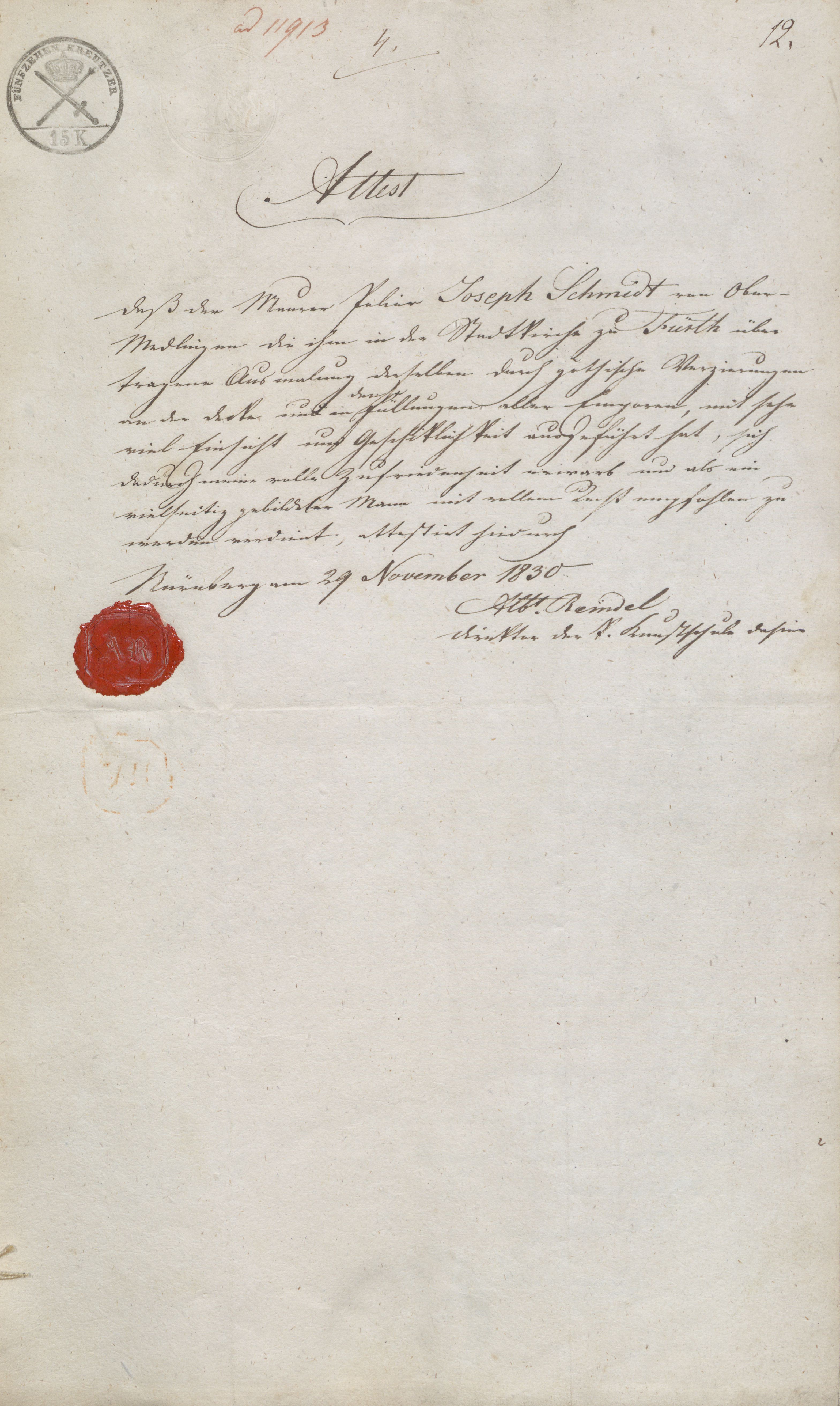 | Beschreibung | Attest von Albert Reindel vom 29. November 1830 | ||