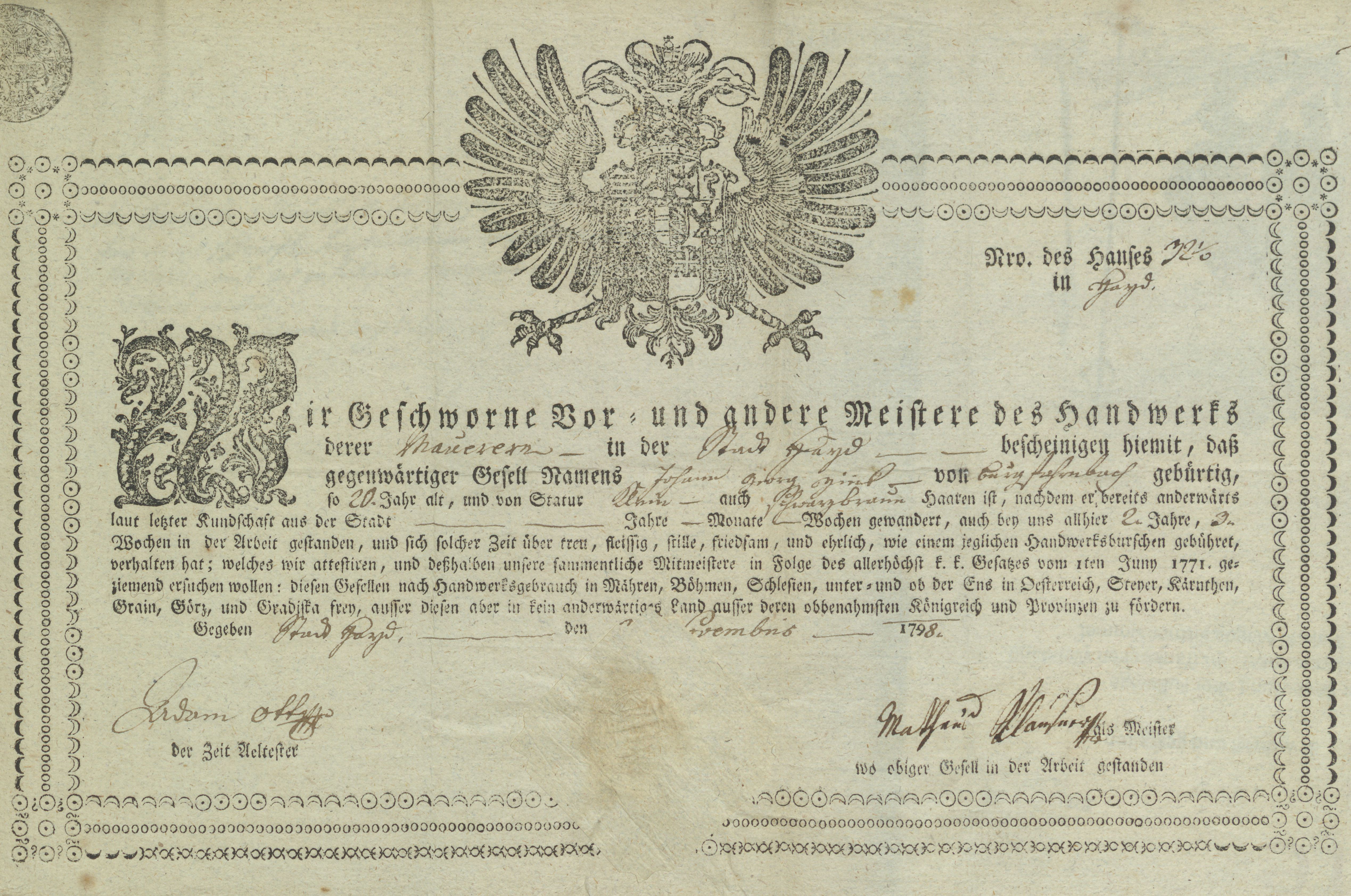 | Beschreibung | Wanderattest für Johann Georg Zink vom 21. November 1798 | ||