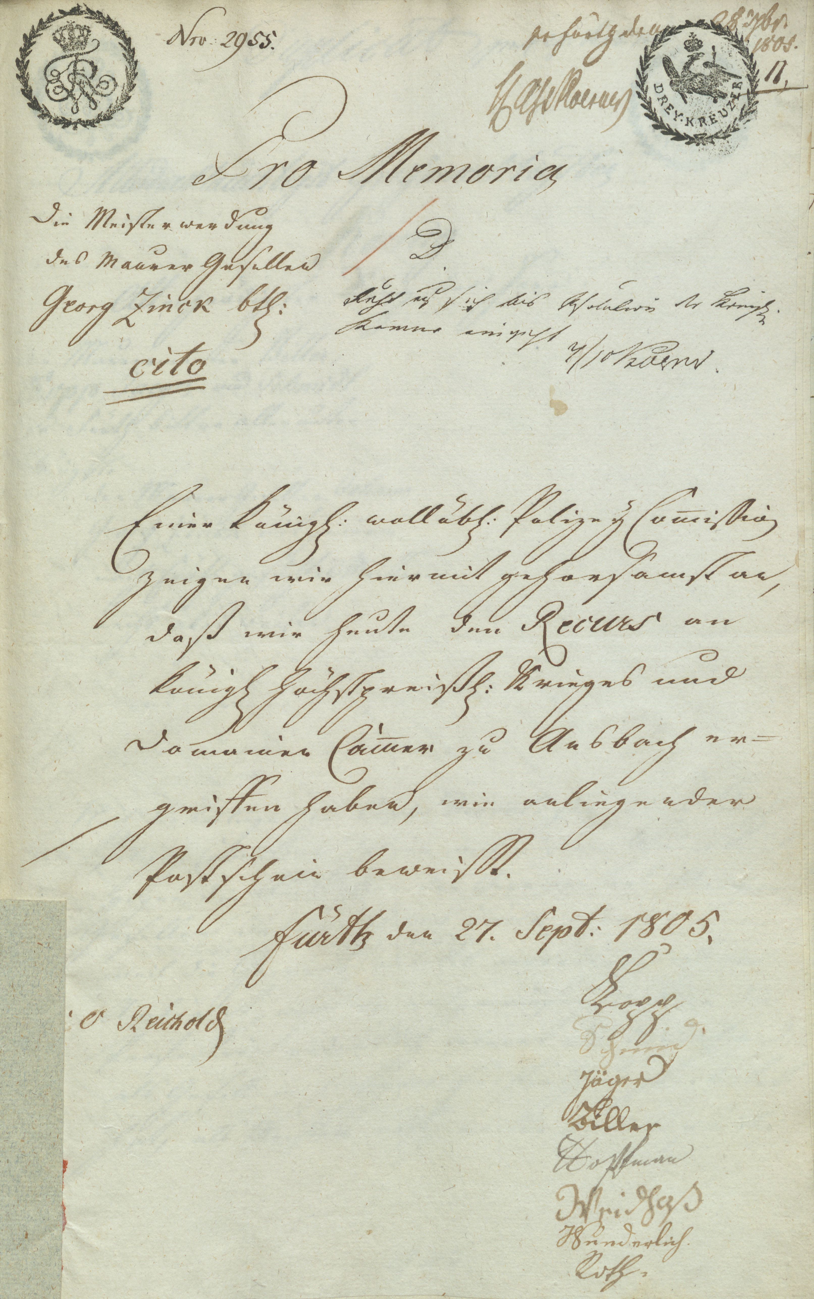 | Beschreibung | Rekurs-Anzeige der Fürther Maurermeister vom 27. Sept. 1805 | ||