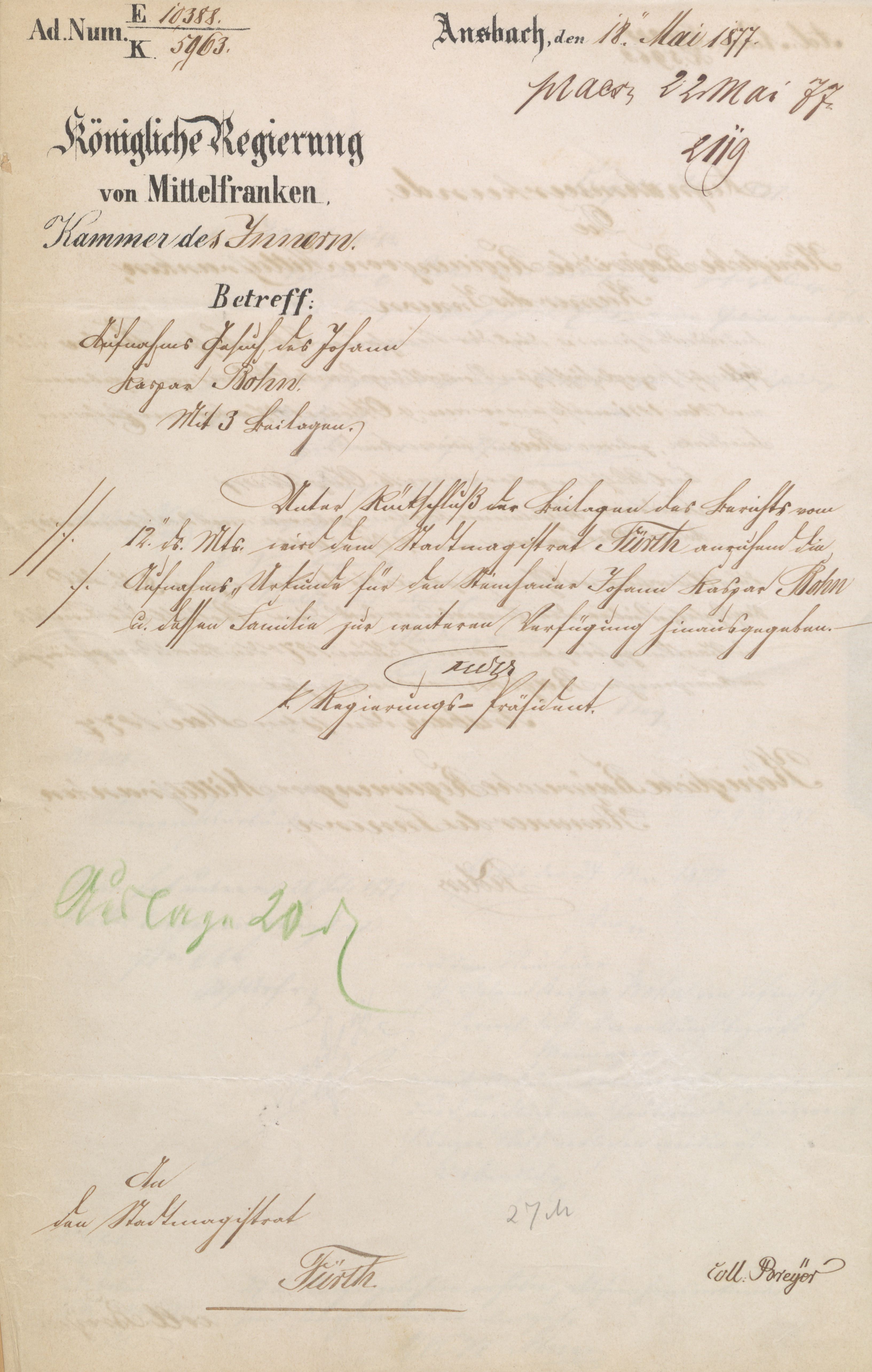 | Beschreibung | Schreiben der Kgl. Reg. von Mittelfranken vom 18. Mai 1877 zur "Aufnahms-Urkunde" für Johann Kaspar Bohn und Familie | ||
