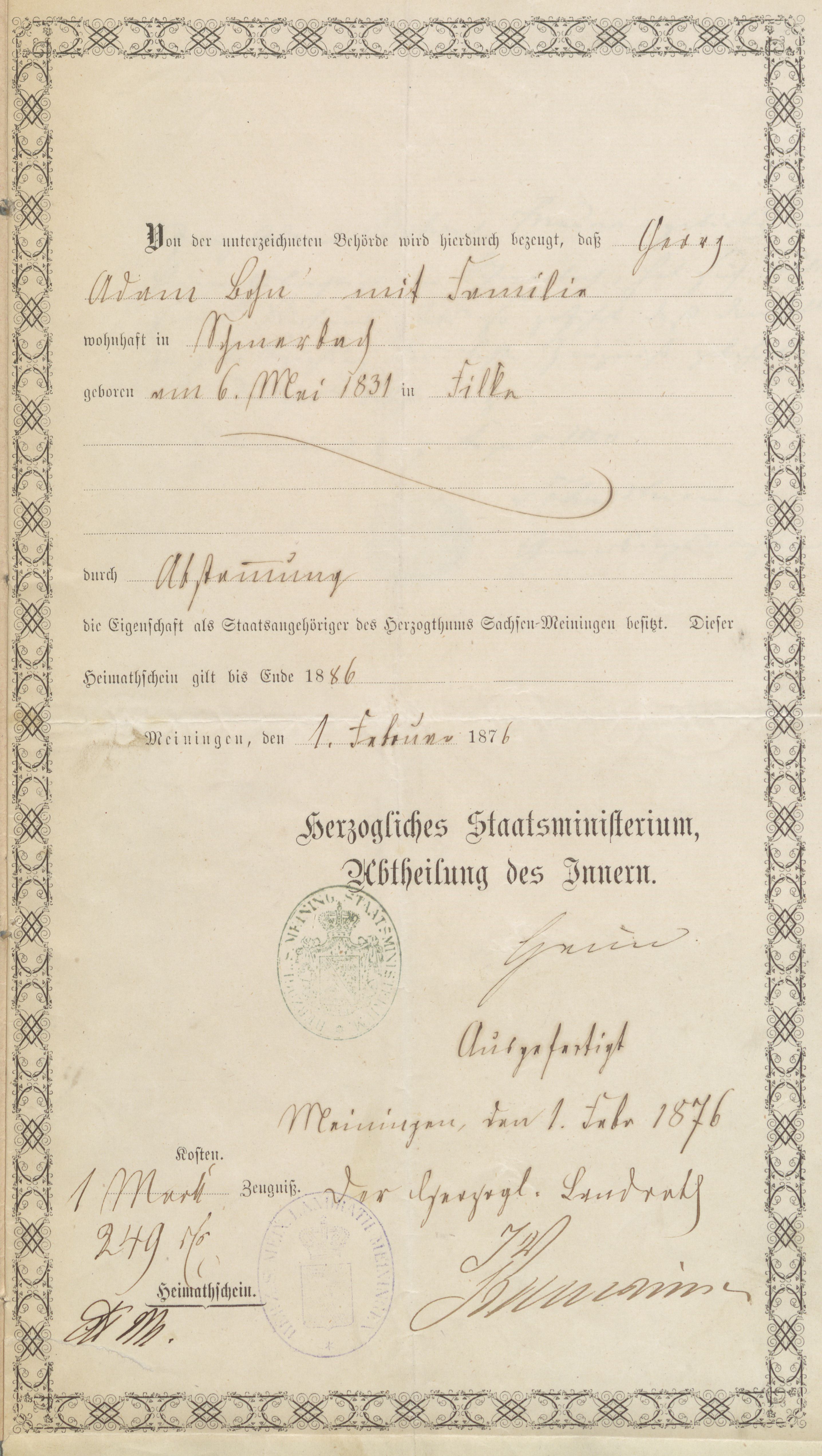 | Beschreibung | Heimatschein für Georg Adam Bohn vom 1. Feb. 1876 | ||