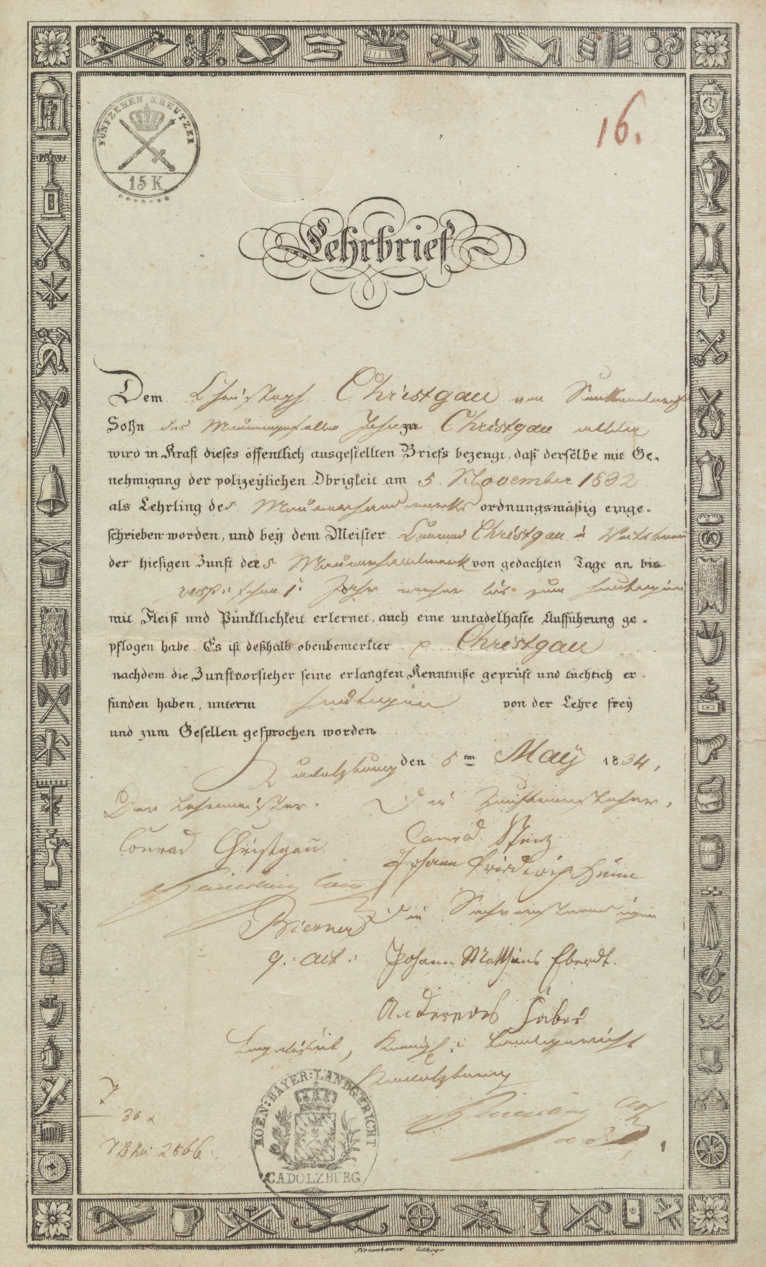 | Dateiinfo (Bild-Unterschrift und Info-Box, automatisch erstellt) | Lehrbrief für Christoph Christgau vom 5. Mai 1834 Lizenz: Bildlizenz-Stadtarchiv | ||