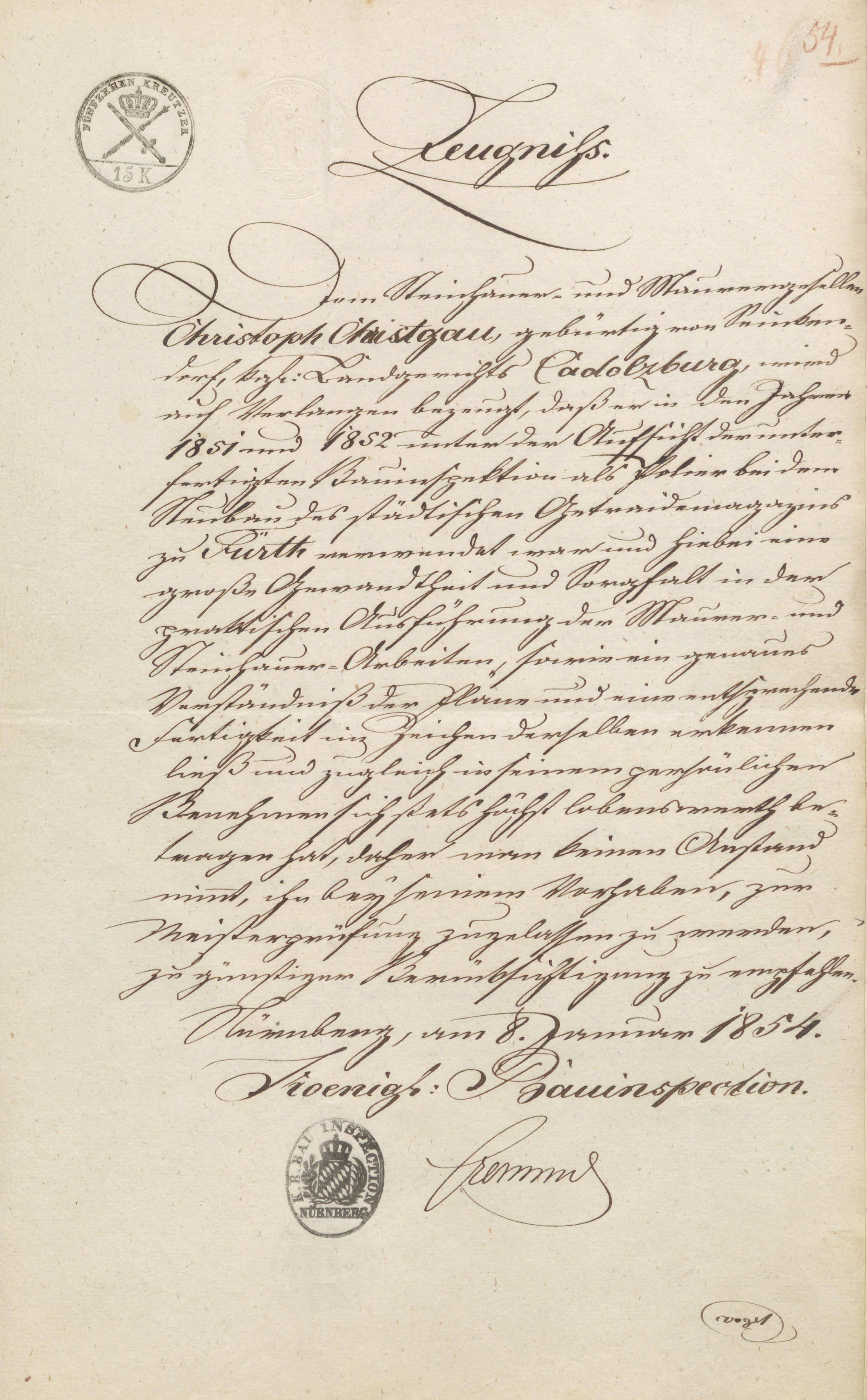 | Dateiinfo (Bild-Unterschrift und Info-Box, automatisch erstellt) | Zeugnis vom 8. Januar 1854, ausgestellt vom kgl. Bauinspektor Frommel Lizenz: Bildlizenz-Stadtarchiv | ||