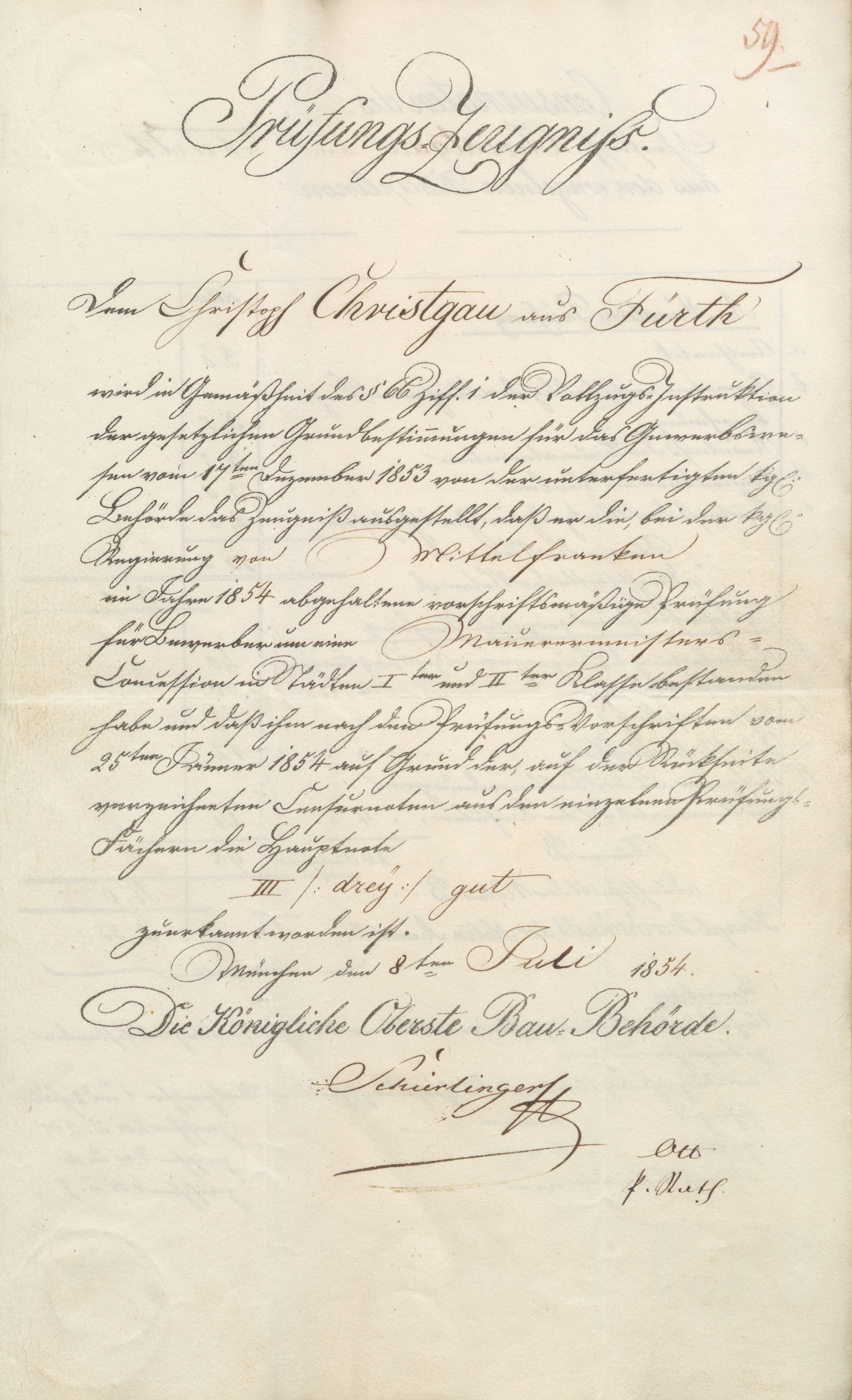 | Beschreibung | Prüfungszeugnis der Obersten Baubehörde vom 8. Juli 1854 (mit Unterschrift des Leiters Franz von Schierlinger) | ||