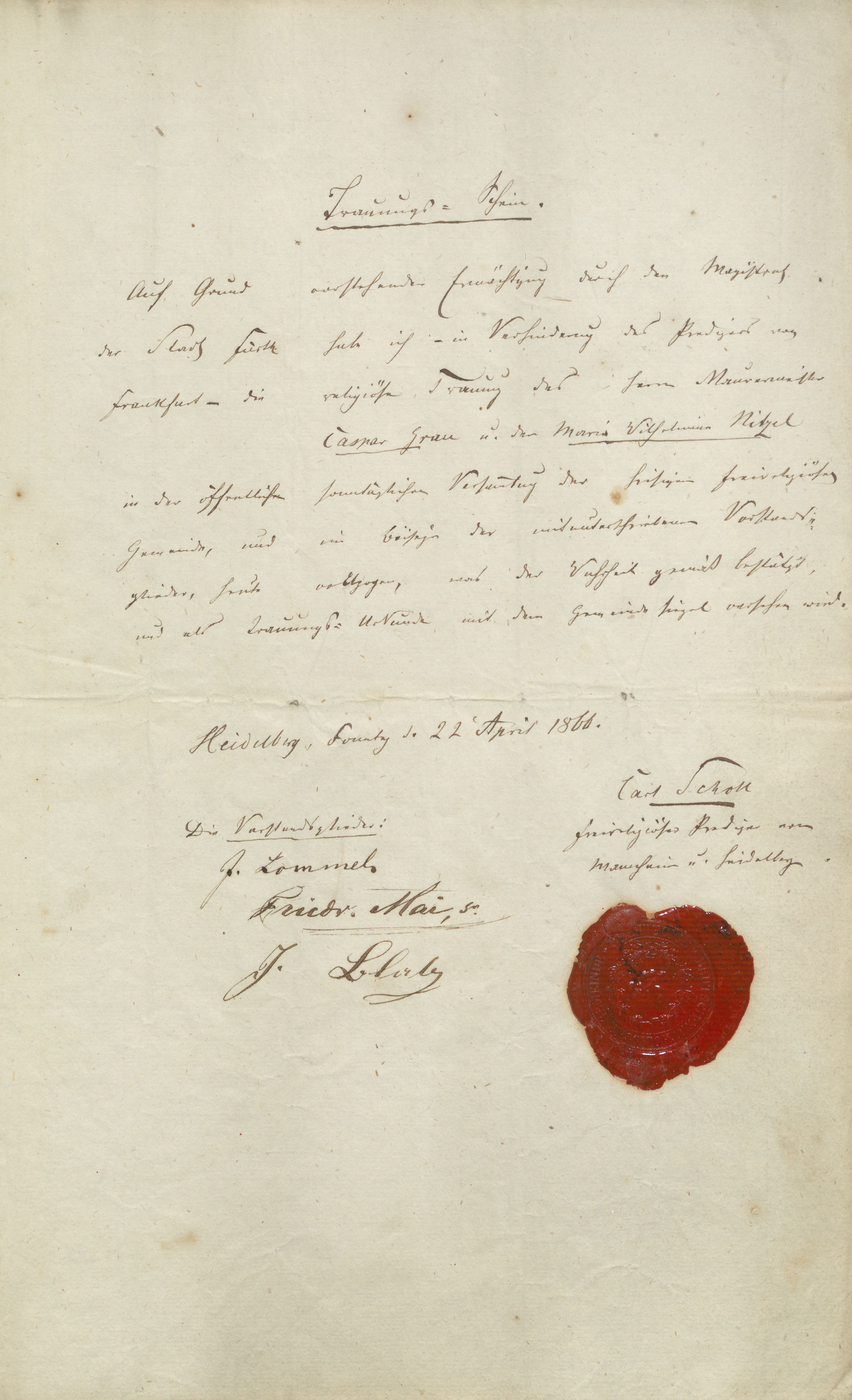 | Beschreibung | Trauschein der zweiten Ehe von Caspar Gran vom 22. April 1866 | ||