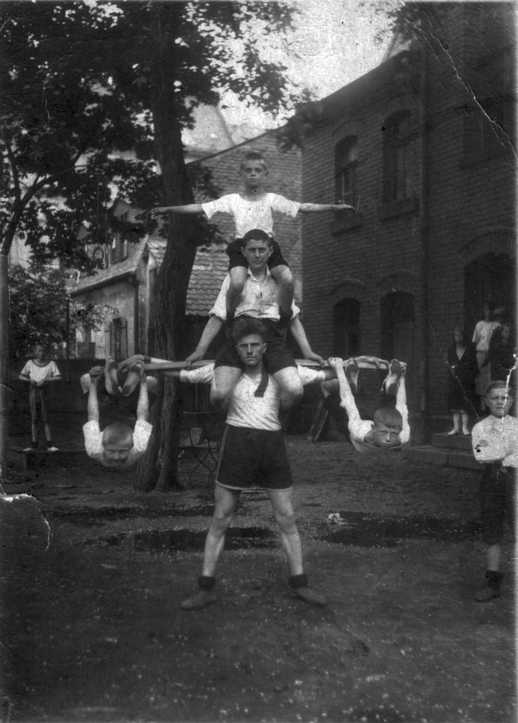 BeschreibungNeben Fußball betrieb die DJK Fürth in der Anfangszeit hauptsächlich Kraftsport. Hans Bachmann, der spätere Ehrenvorsitzende des Vereins, an der Basis.
