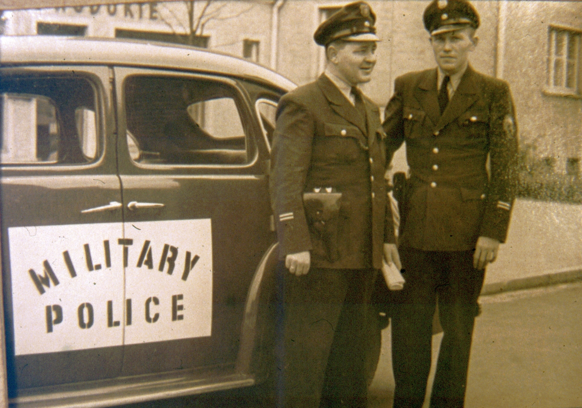 | Beschreibung | Zwei Stadtpolizisten vor einem Streifenwagen der amerikanischen Militärpolizei (1949) | ||