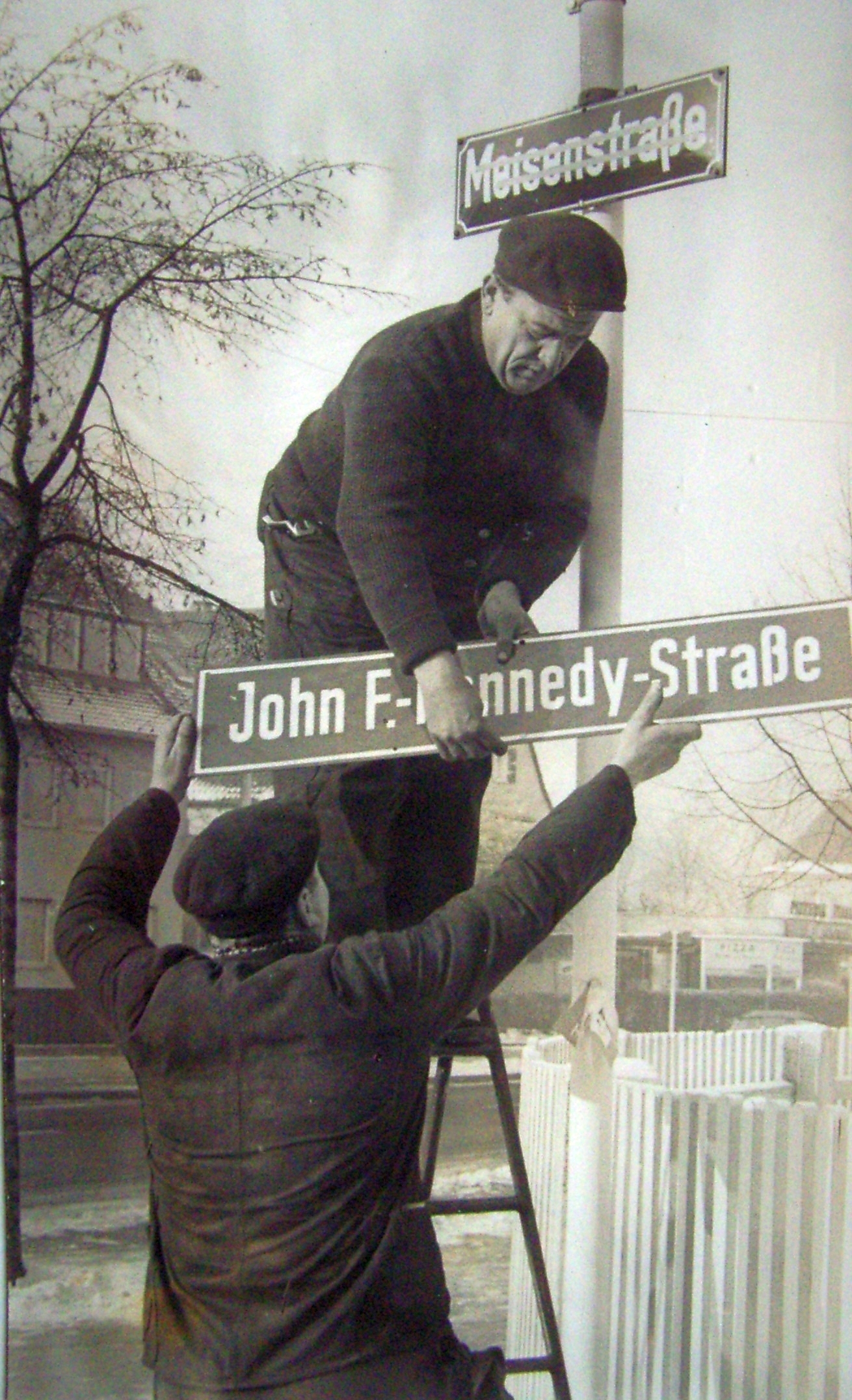 | Dateiinfo (Bild-Unterschrift und Info-Box, automatisch erstellt) | Umbenennung der Meisenstraße in John-F.-Kennedy-Straße (1963). Urheber: Knut Meyer/VNP<br><br>Lizenz: copyright | ||