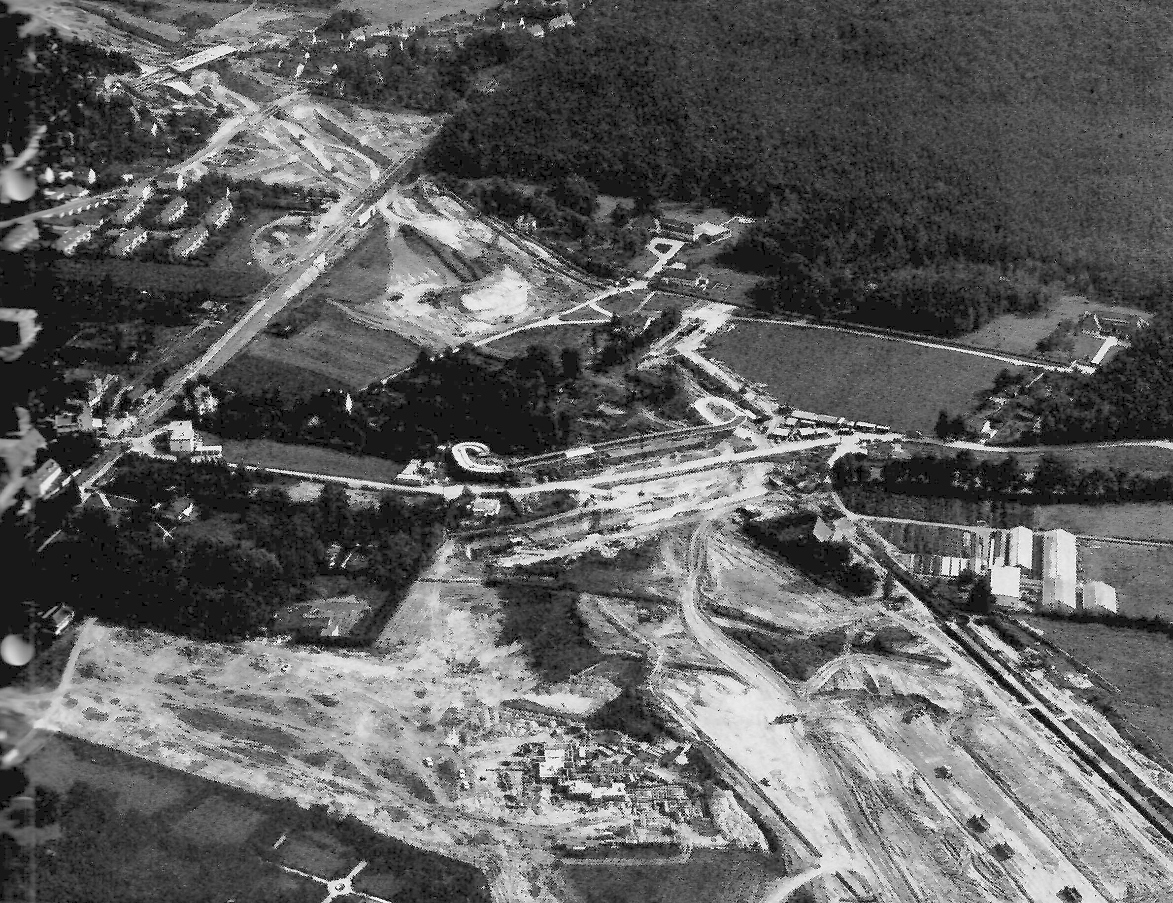 | Beschreibung | Bau des Main-Donau-Kanals in Dambach. Vorne der Eschenausteg, dann die Bahnlinie Fürth-Cadolzburg und die Zirndorfer Brücke (1970) | ||