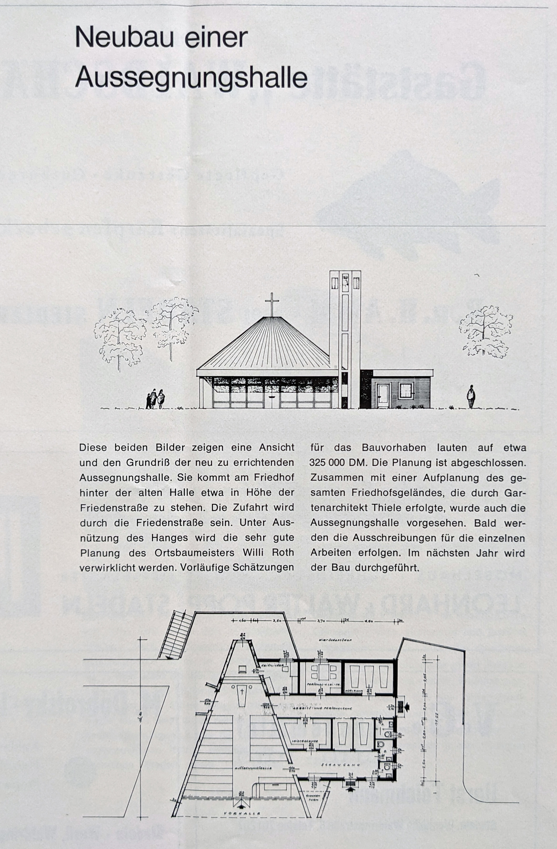 | Dateiinfo (Bild-Unterschrift und Info-Box, automatisch erstellt) | Plan für die Aussegnungs- und Leichenhalle auf dem Stadelner Friedhof, November 1970 Lizenz: CC BY-SA 3.0 | ||
