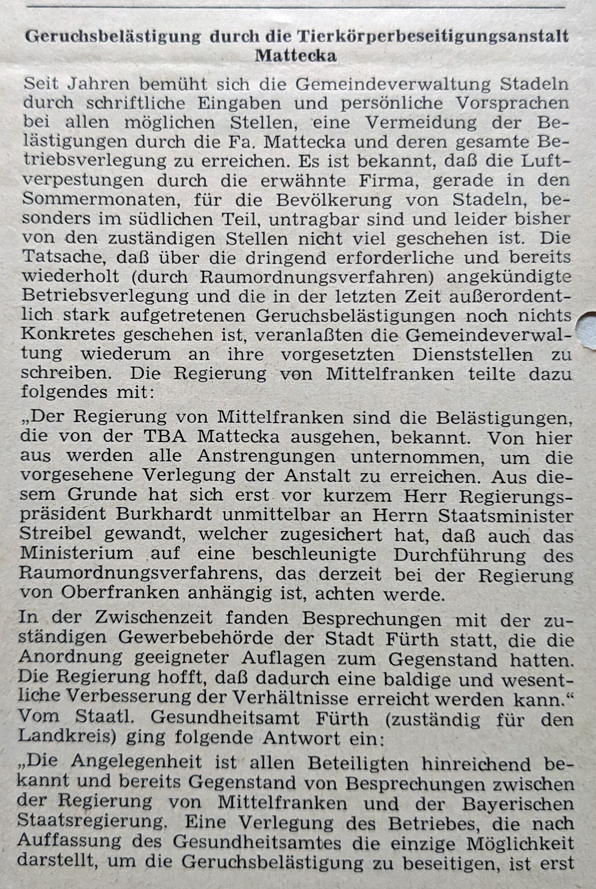 | Beschreibung | Auszug aus dem Stadelner Amtsblatt bzgl. der Tierkörpberbeseitigungsanlage der Firma Mattecka, September 1971 | ||