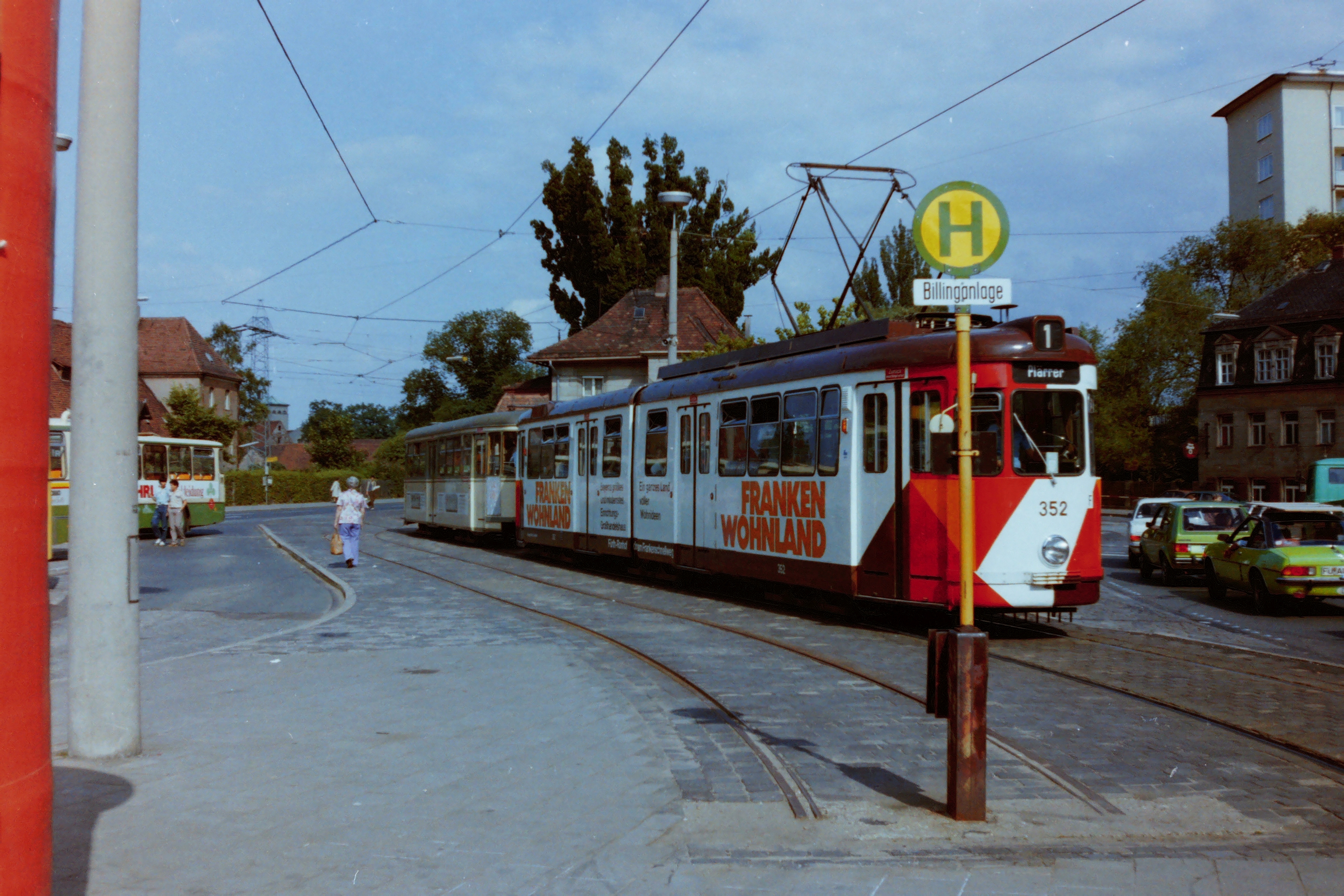 | Beschreibung | Triebwagen 352 als Linie 1 fährt in die Billinganlage ein. Links daneben das Abstellgleis (1980). | ||