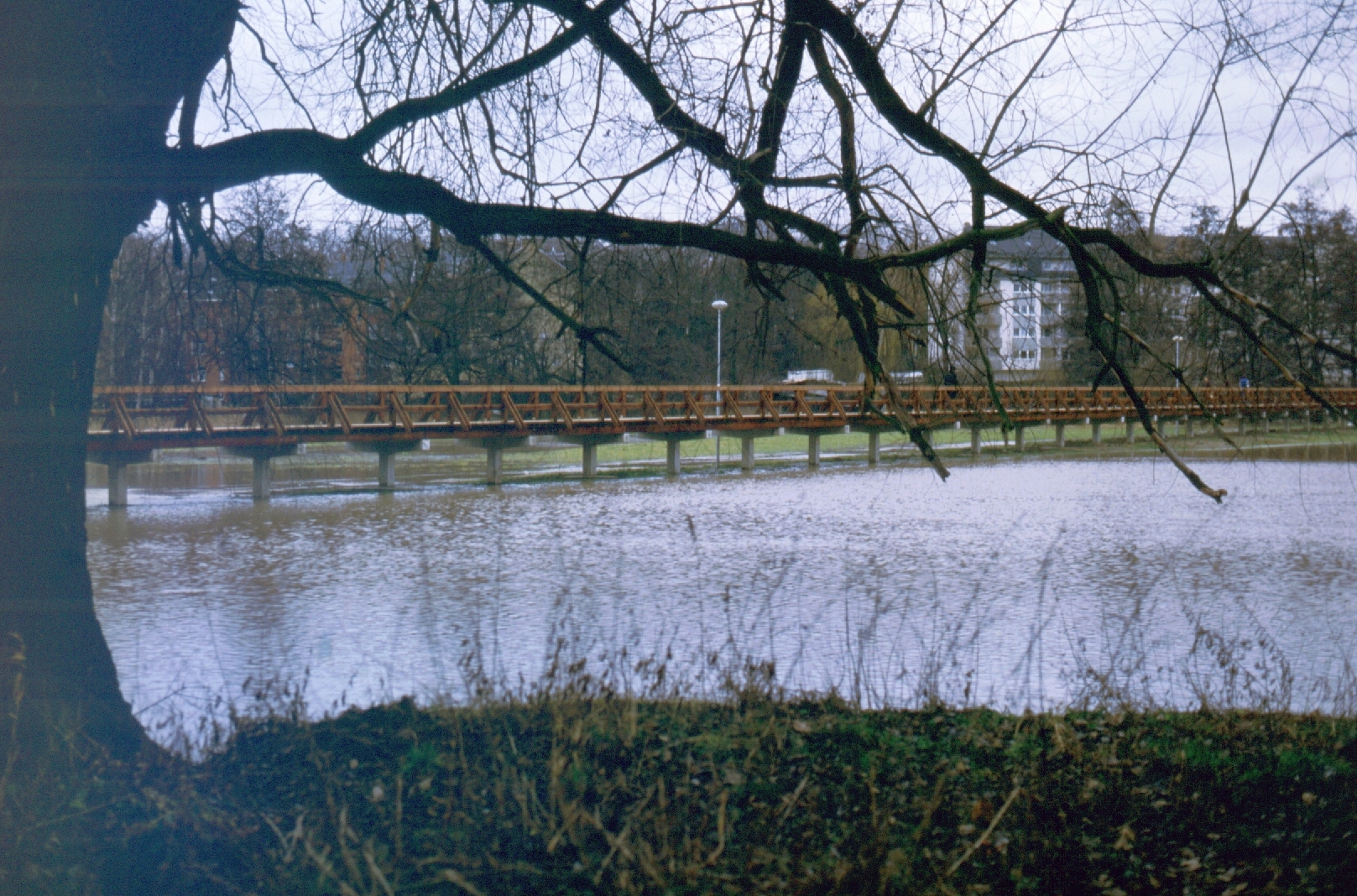 | Beschreibung | Hochwasser im Wiesengrund mit Hardsteg, Blickrichtung Waldmannsweiher und Innenstadt. Aufnahme Dezember 1986. | ||