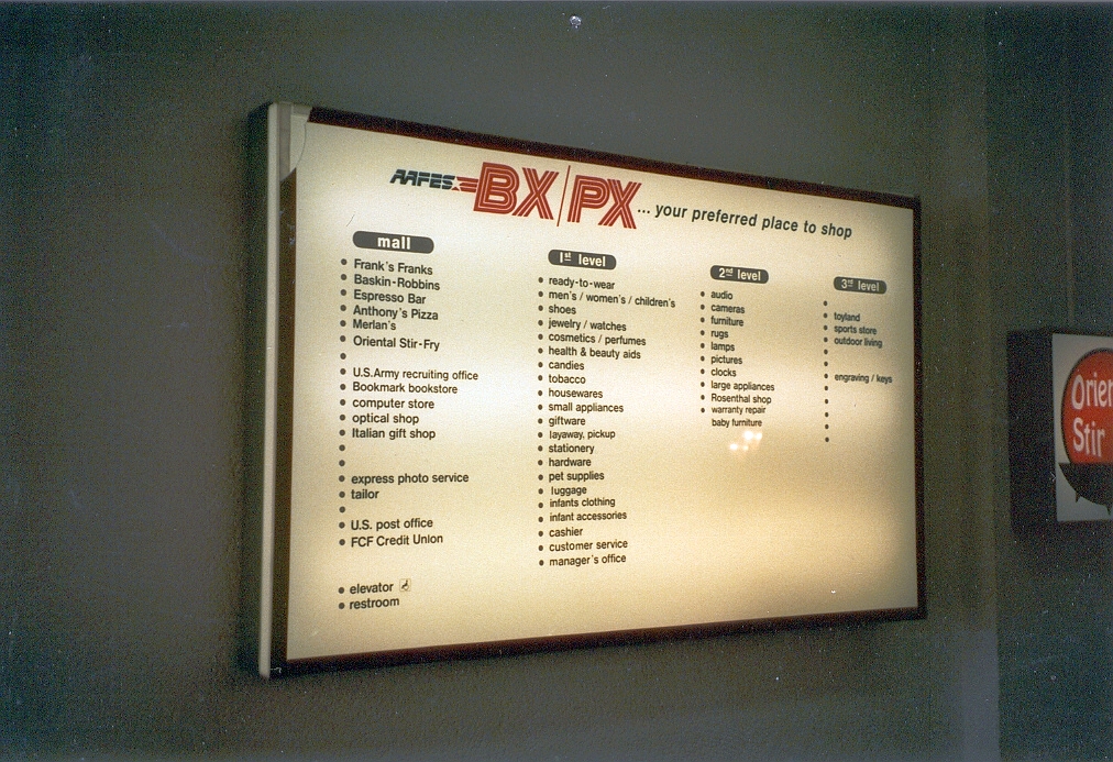 | Beschreibung | Hinweisschild im PX (1994) | ||