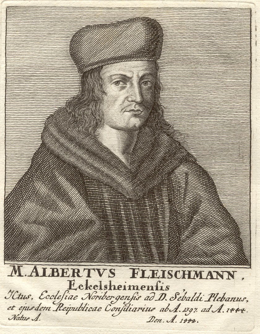 | Dateiinfo (Bild-Unterschrift und Info-Box, automatisch erstellt) | Albrecht Fleischmann, Poppenreuther Pfarrer von 1397 - 1444 Urheber: Radierung/Georg Wolfgang Knorr<br>Lizenz: CC BY-SA 3.0 | ||