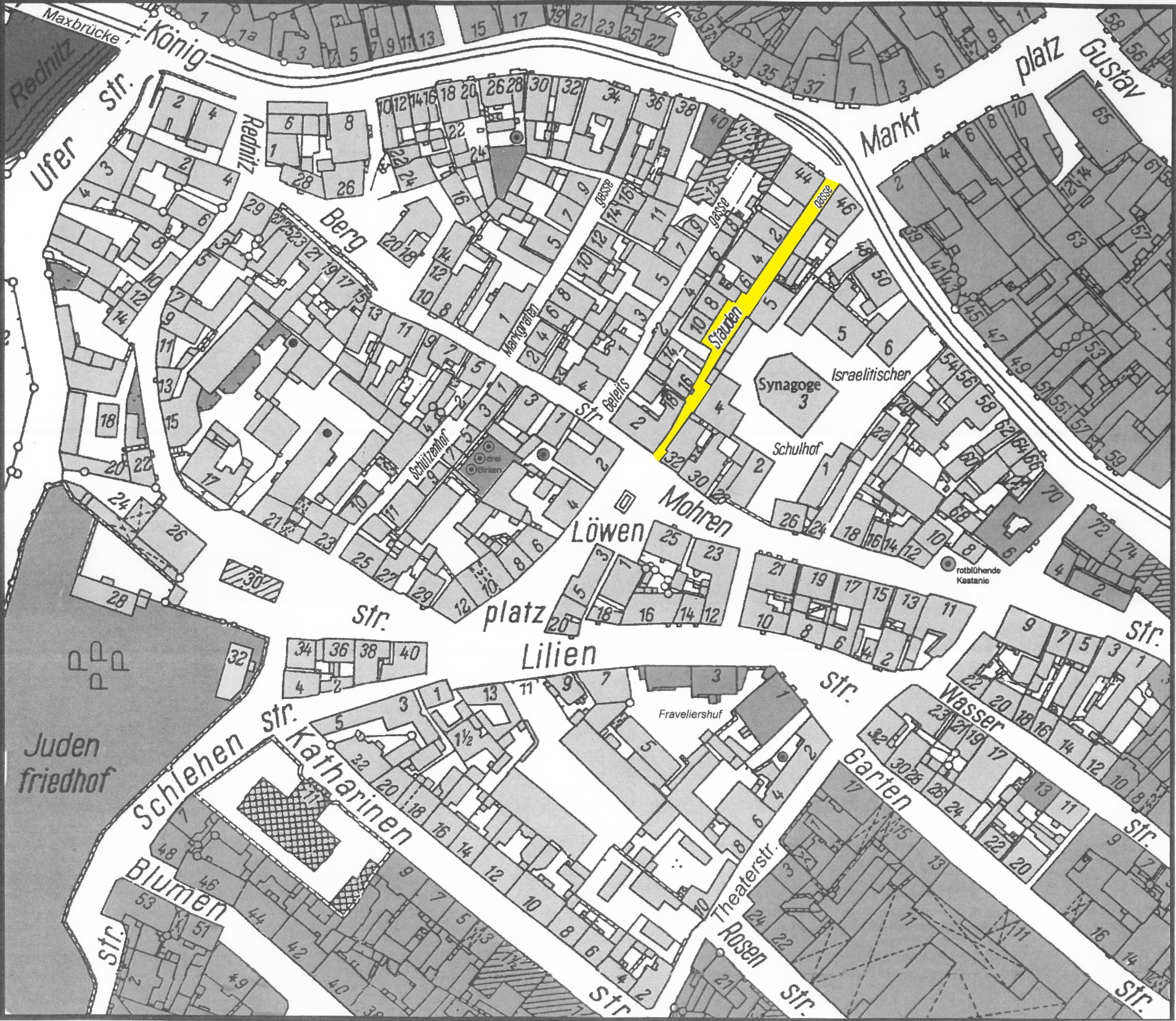 | Dateiinfo (Bild-Unterschrift und Info-Box, automatisch erstellt) | Gänsberg-Plan Staudengasse gelb markiert Urheber: Lothar Berthold<br>Lizenz: CC BY-SA 3.0 | ||