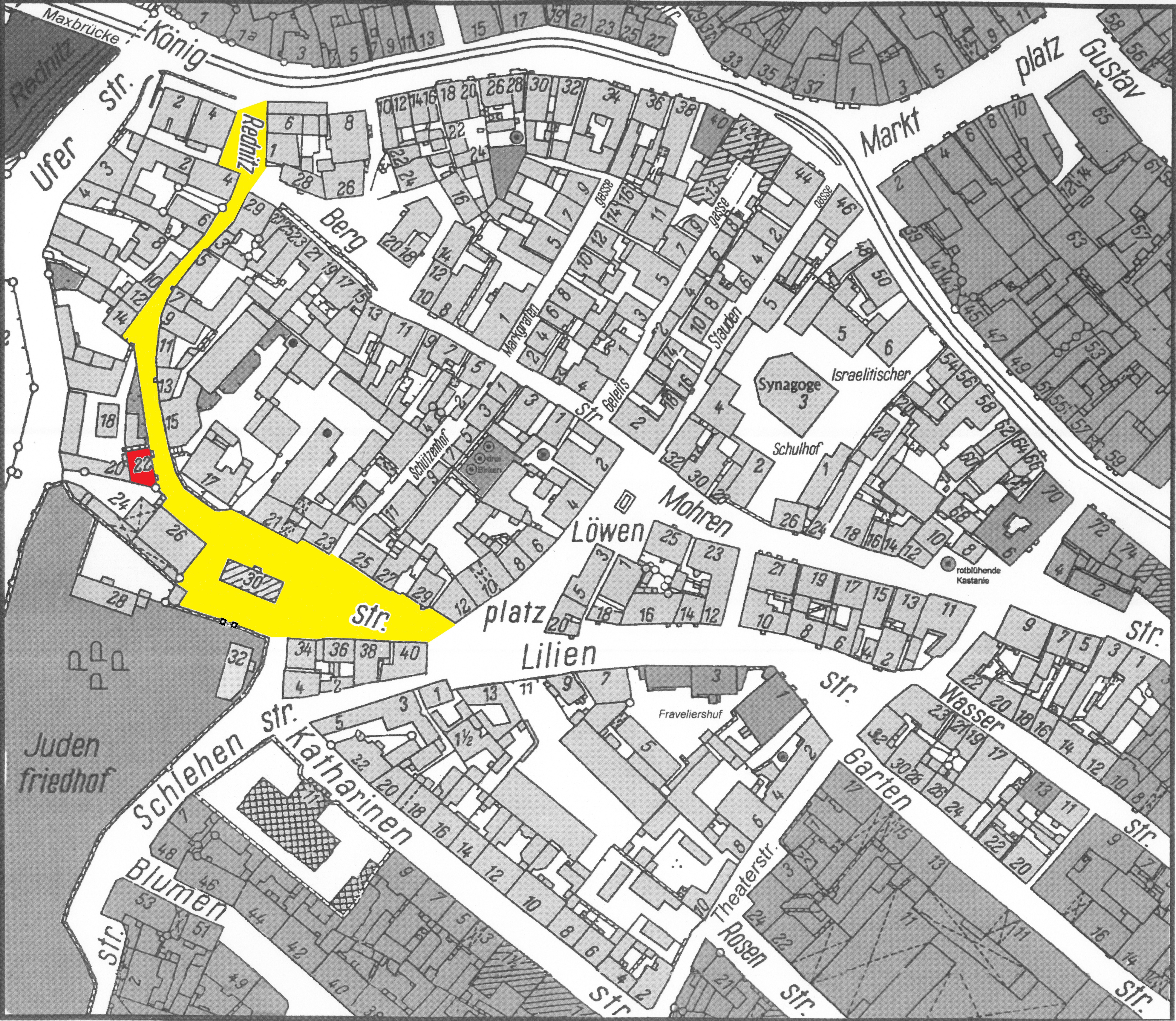 | Dateiinfo (Bild-Unterschrift und Info-Box, automatisch erstellt) | Gänsberg-Plan Rednitzstraße 22 ist rot markiert Urheber: Lothar Berthold<br>Lizenz: CC BY-SA 3.0 | ||