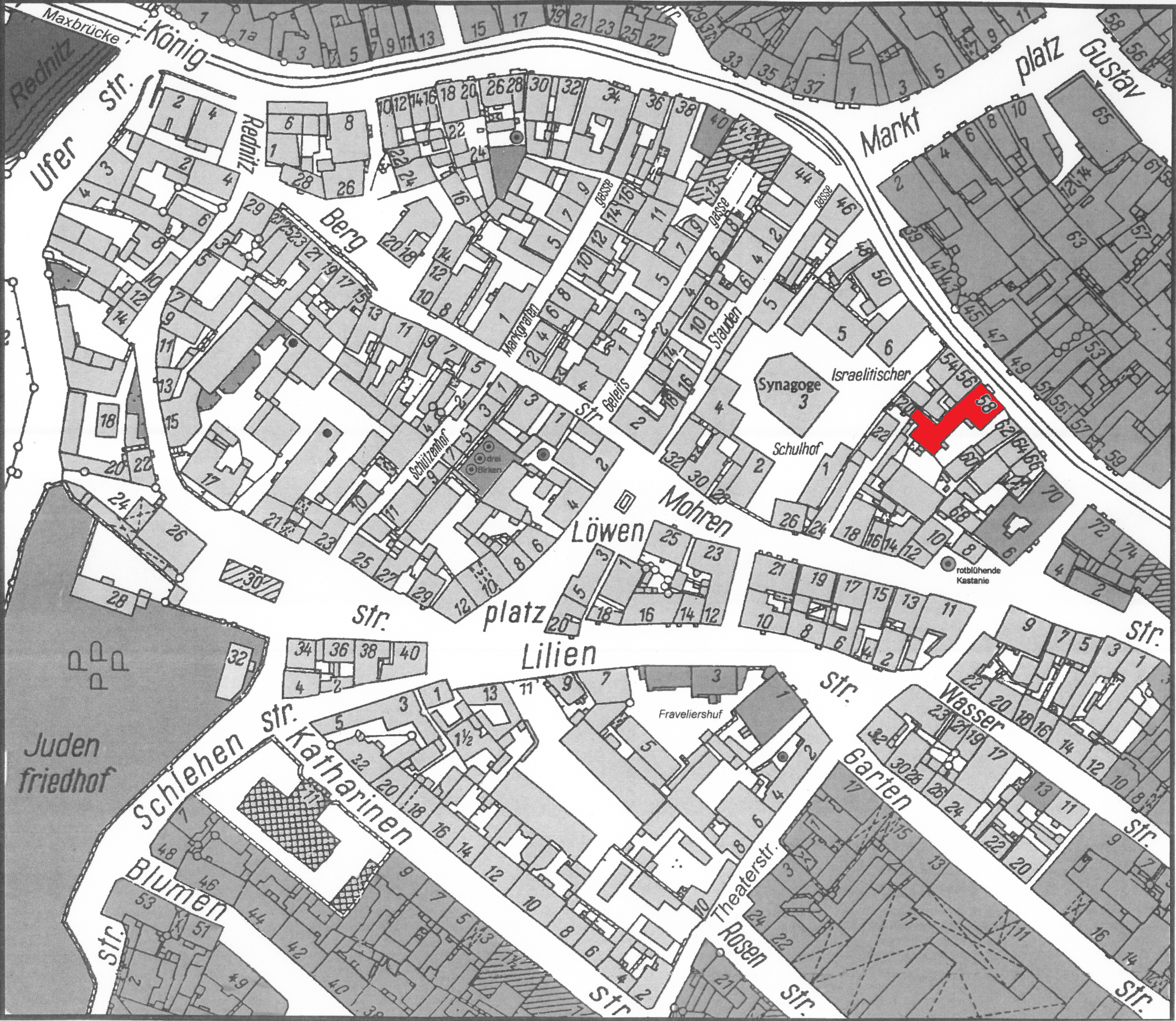 | Dateiinfo (Bild-Unterschrift und Info-Box, automatisch erstellt) | Gänsberg-Plan, Königstraße 58 rot markiert Urheber: Lothar Berthold<br>Lizenz: CC BY-SA 3.0 | ||