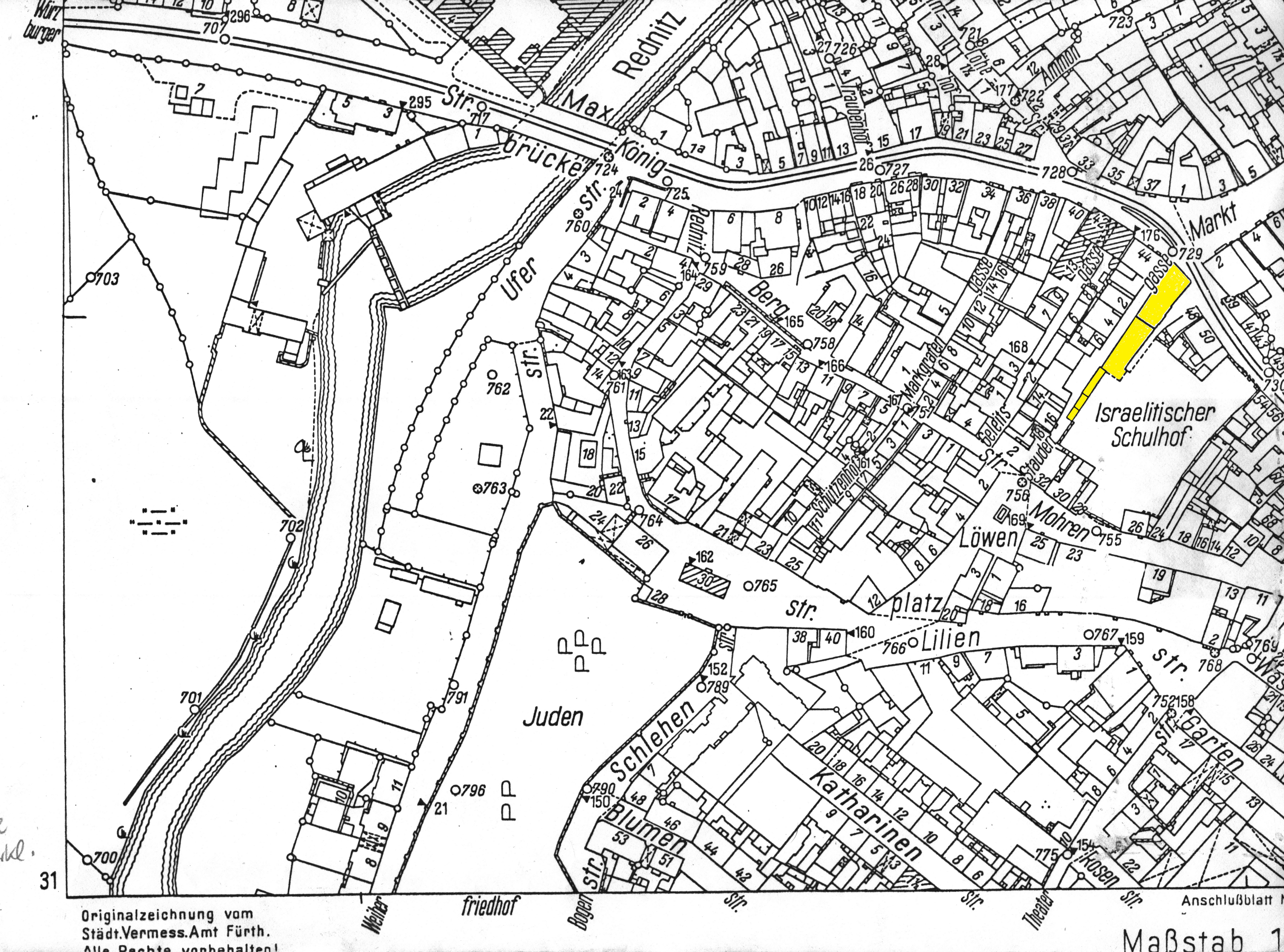| Dateiinfo (Bild-Unterschrift und Info-Box, automatisch erstellt) | Gänsbergplan Stadt Fürth; Abriss von Königstraße 46 und Staudengasse 5 gelb markiert, 1956 Urheber: Stadt Fürth, Stadtplanungsamt / Abt. Vermessung<br>Lizenz: CC BY-SA 3.0 | ||
