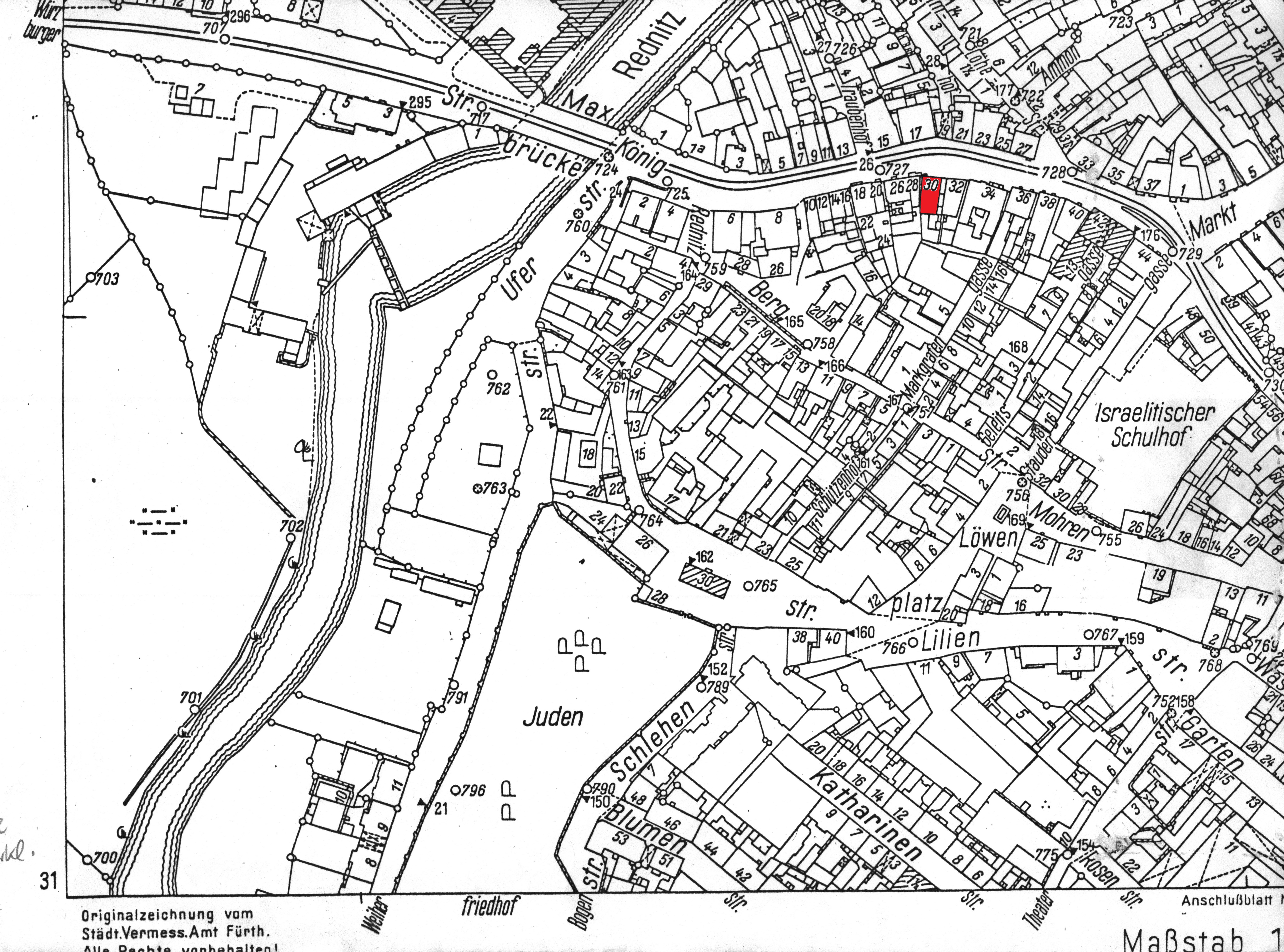 | Dateiinfo (Bild-Unterschrift und Info-Box, automatisch erstellt) | Gänsbergplan Stadt Fürth; Königstraße 30 rot markiert Urheber: Stadt Fürth, Stadtplanungsamt / Abt. Vermessung<br>Lizenz: CC BY-SA 3.0 | ||