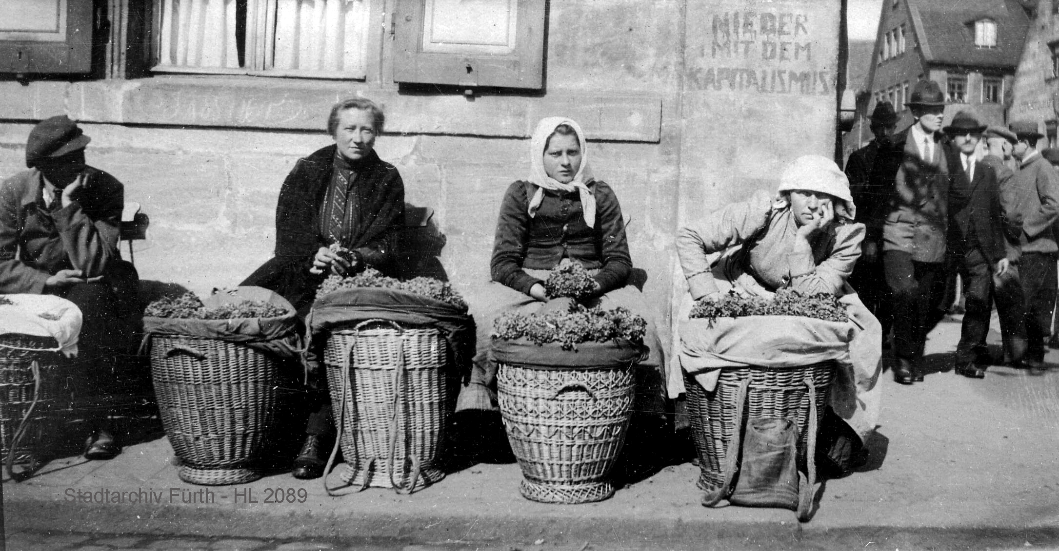 | Dateiinfo (Bild-Unterschrift und Info-Box, automatisch erstellt) | Am Obstmarkt mit Aufschrift an der Königstraße 76 "Nieder mit dem Kapitalismus" Urheber: Johann Georg Heinrich Lotter<br>Lizenz: Bildlizenz-Stadtarchiv | ||