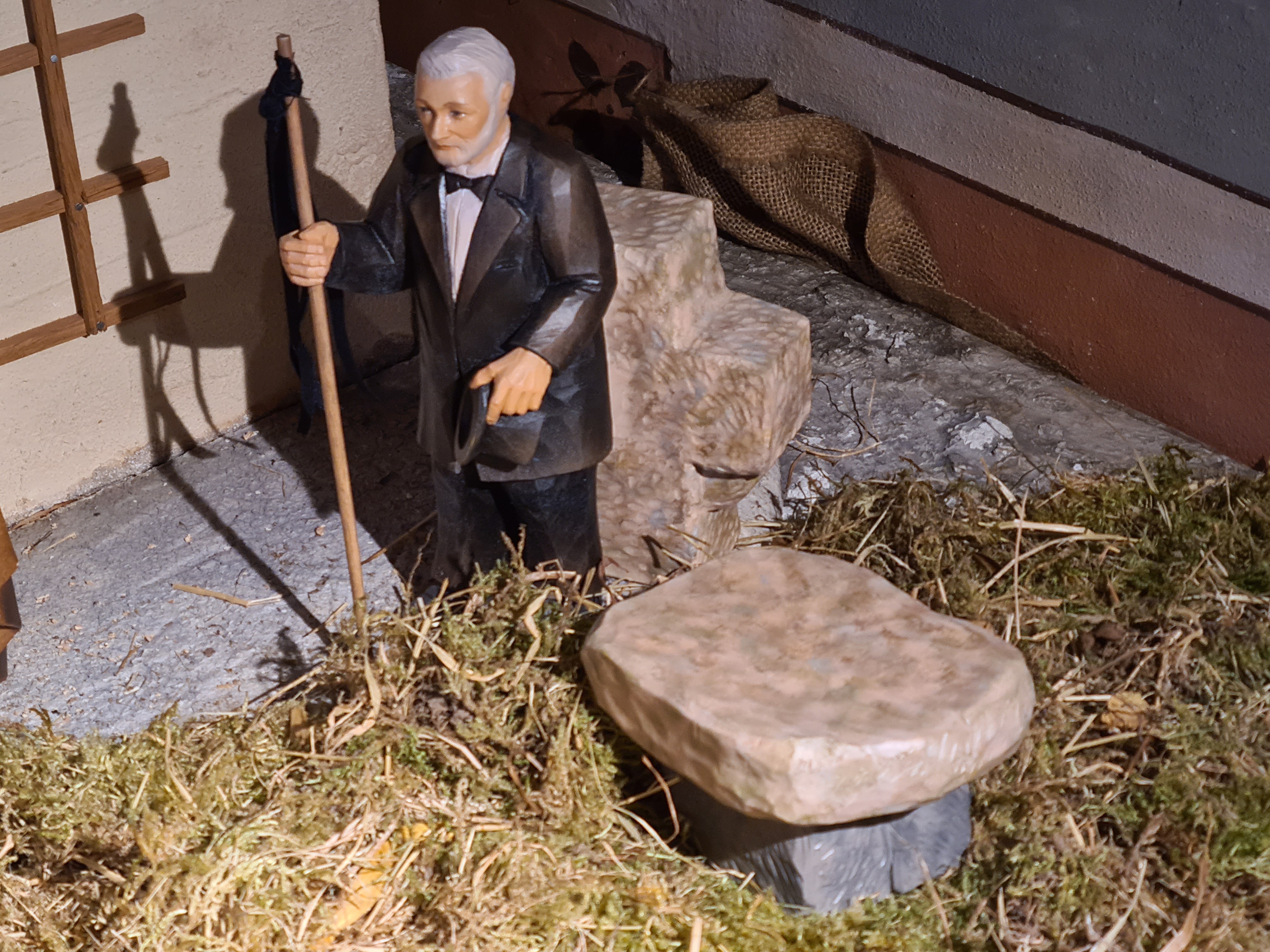 Der Leichenbitter steht am Poppenreuther Sühnekreuz, bzw. Ruhestein. Die Figur trägt Züge von Kurt Schubert, dem Krippenbauer der Poppenreuther Weihnachtskrippe.