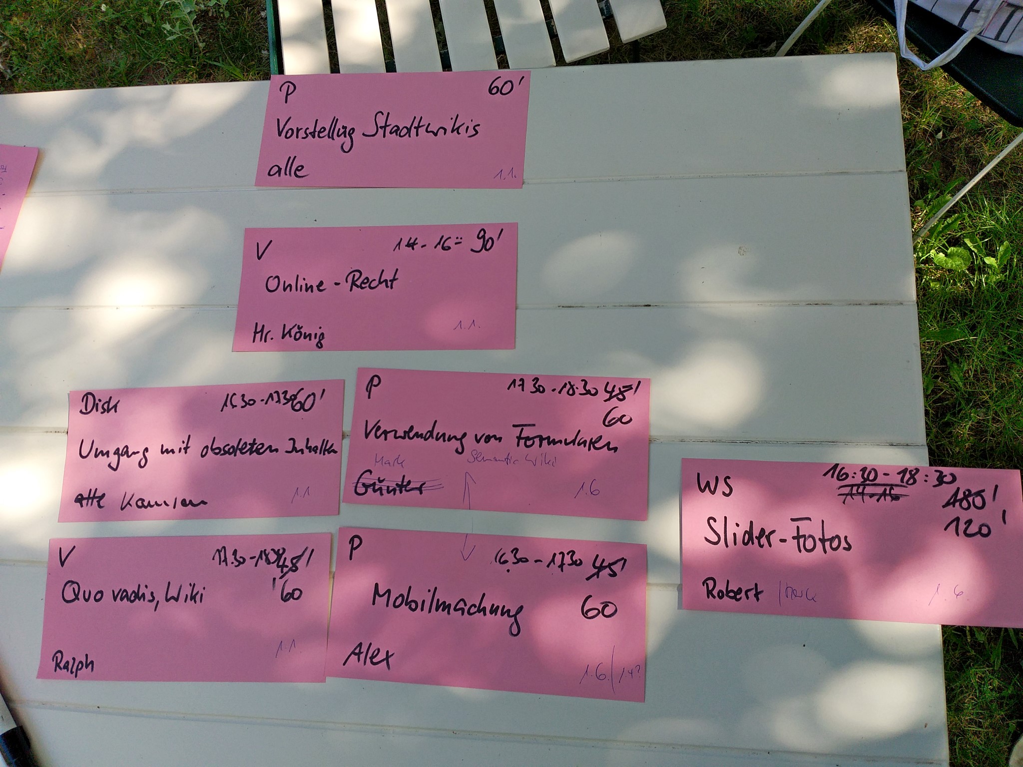 | Dateiinfo (Bild-Unterschrift und Info-Box, automatisch erstellt) | Ergebnis der Agenda-Feinplanung von Kamran Salimi und Ralph Stenzel im Garten des Erstgenannten Urheber: Ralph Stenzel<br><br><br>Lizenz: CC BY-SA 3.0 | ||