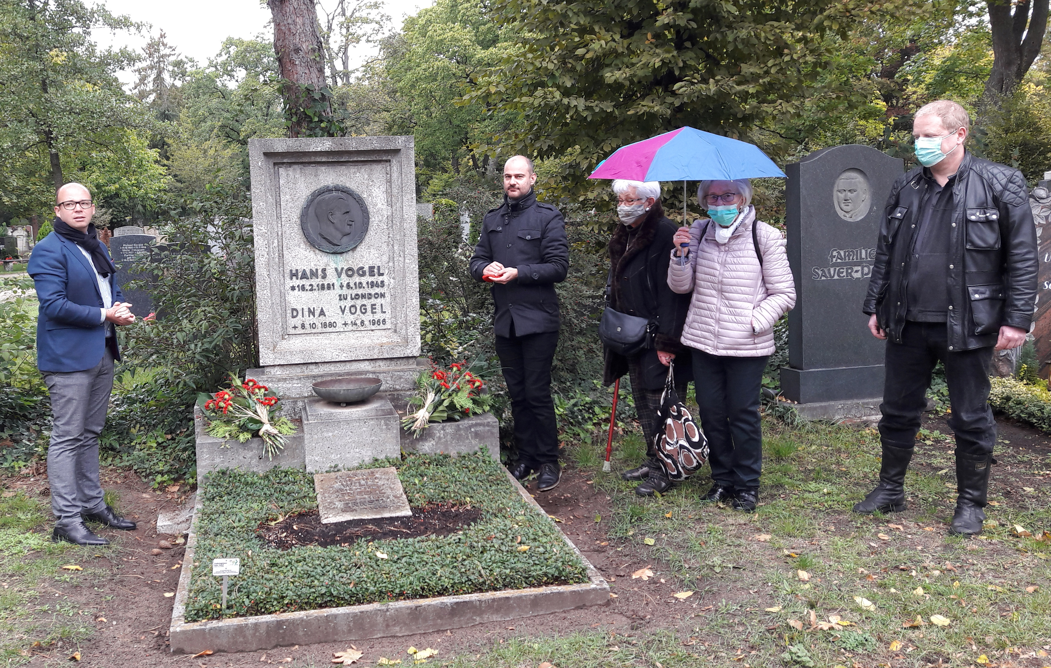 | Dateiinfo (Bild-Unterschrift und Info-Box, automatisch erstellt) | Gedenken an den Fürther Sozialdemokraten Hans Vogel anlässlich seines 75. Todestags am Nürnberger ... Gedenken an den Fürther Sozialdemokraten Hans Vogel anlässlich seines 75. Todestags am Nürnberger Familiengrab (Westfriedhof); v.l.n.r.: Thorsten Brehm (SPD Nbg.), Matthias Dornhuber (SPD Fürth), Nichten Pauline Meier, Mathilde Wening (Fürth), Großneffe Christian Körner (Nbg.)<br>Urheber: Karin Jungkunz<br><br><br>Lizenz: copyright | ||