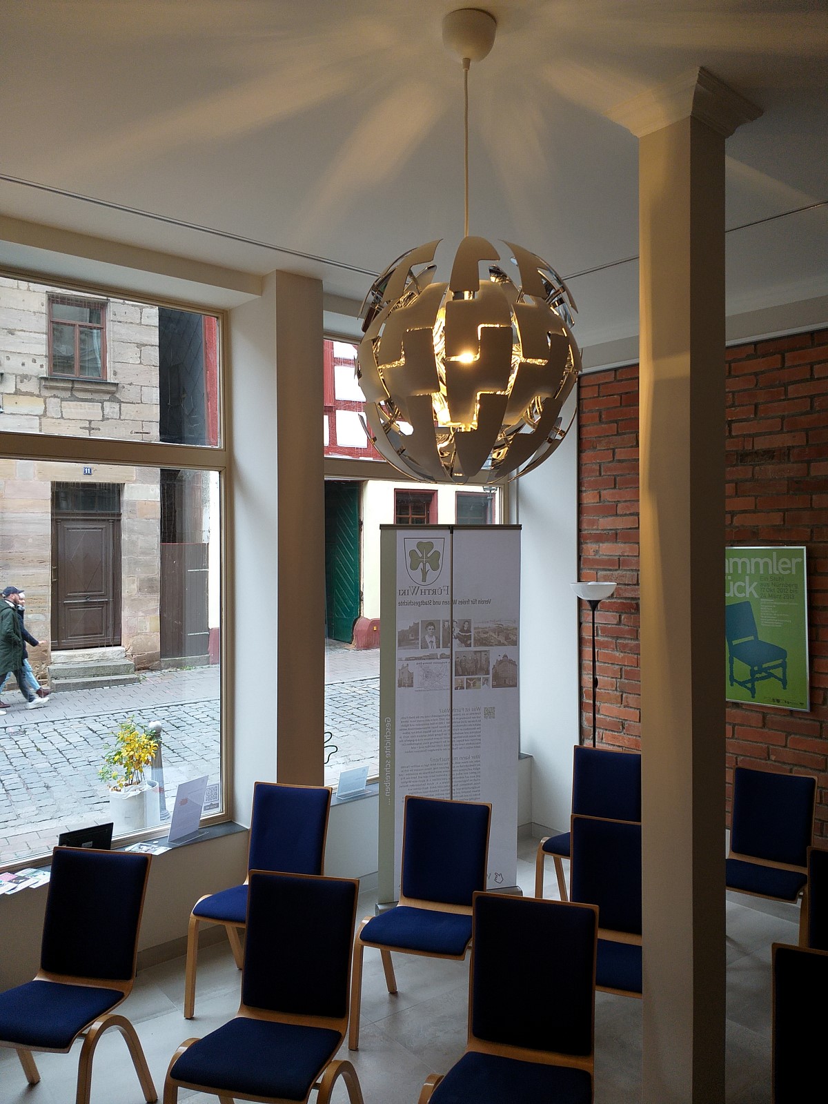 | Dateiinfo (Bild-Unterschrift und Info-Box, automatisch erstellt) | FürthWiki-Laden, an den "Wikipedia-Globus" erinnernde Deckenleuchte im Vortragsraum Urheber: Ralph Stenzel<br><br>Lizenz: CC BY-SA 3.0 | ||