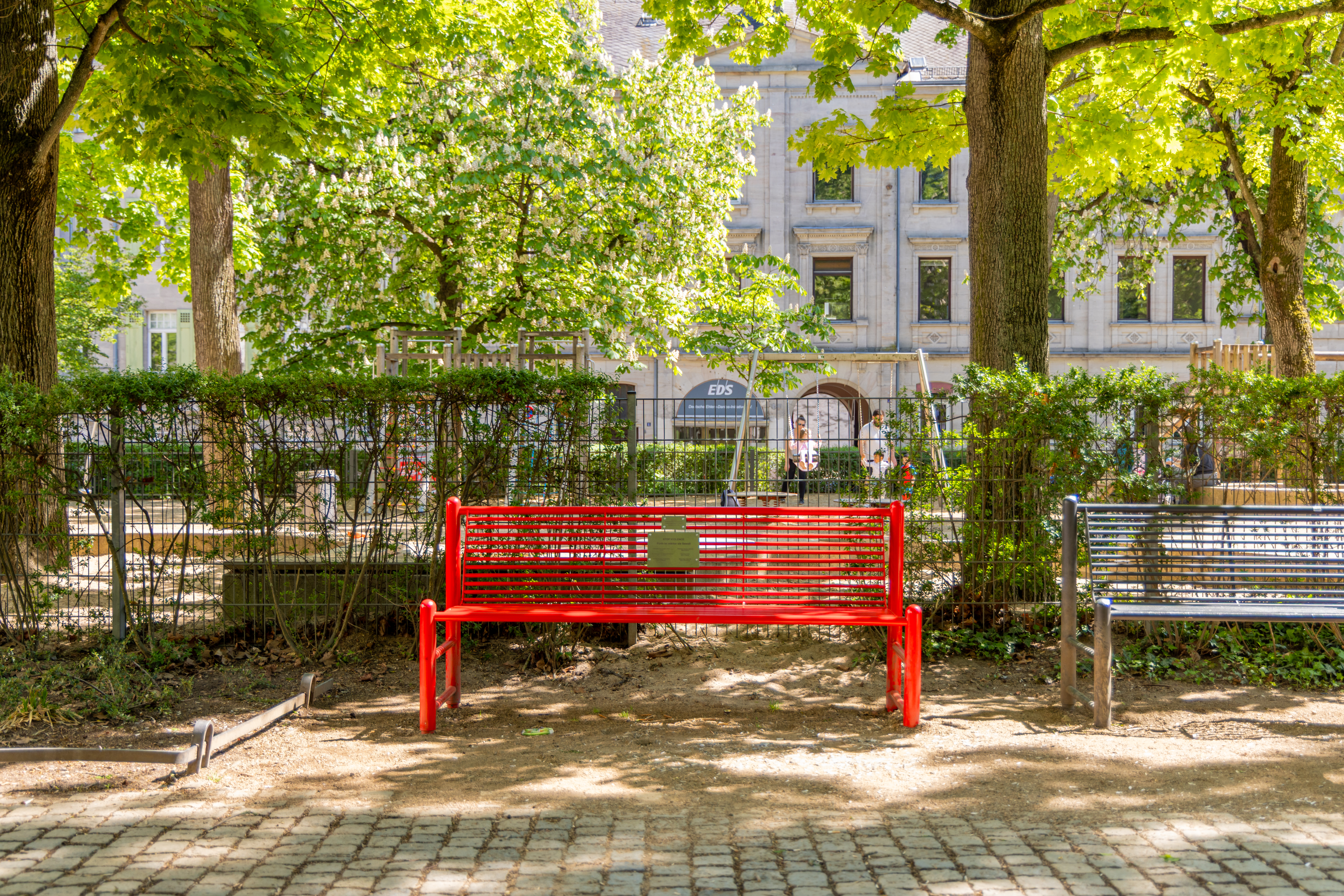 | Beschreibung | Rote Bank in der Adenaueranlage. Stand 2025 sind 8 an der Zahl im Stadtgebiet aufgestellt. | ||