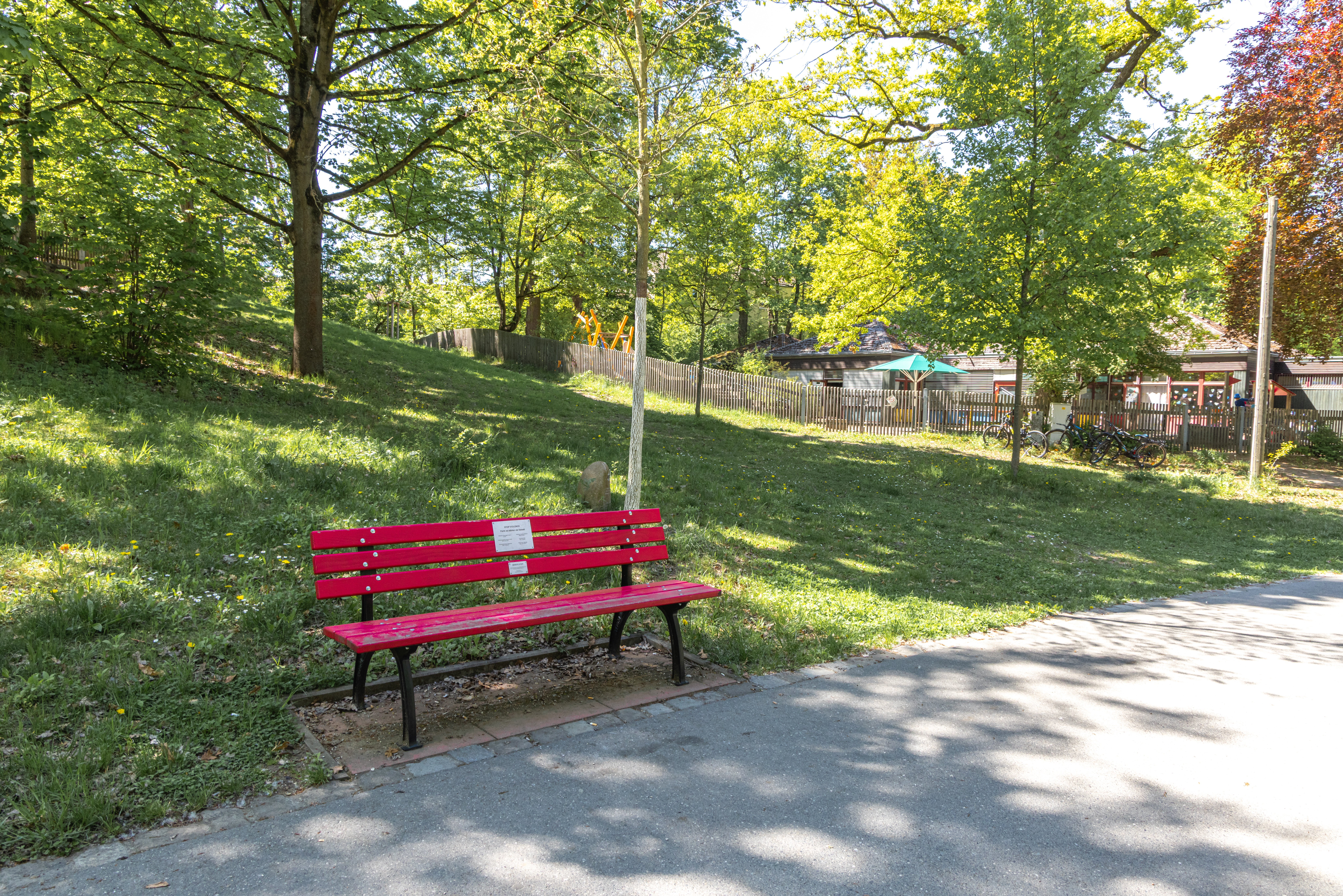 | Dateiinfo (Bild-Unterschrift und Info-Box, automatisch erstellt) | Rote Bank im Stadtpark. Stand 2025 sind 8 an der Zahl im Stadtgebiet aufgestellt. Urheber: Claus W. Vogl<br><br>Lizenz: CC BY-SA 4.0 | ||