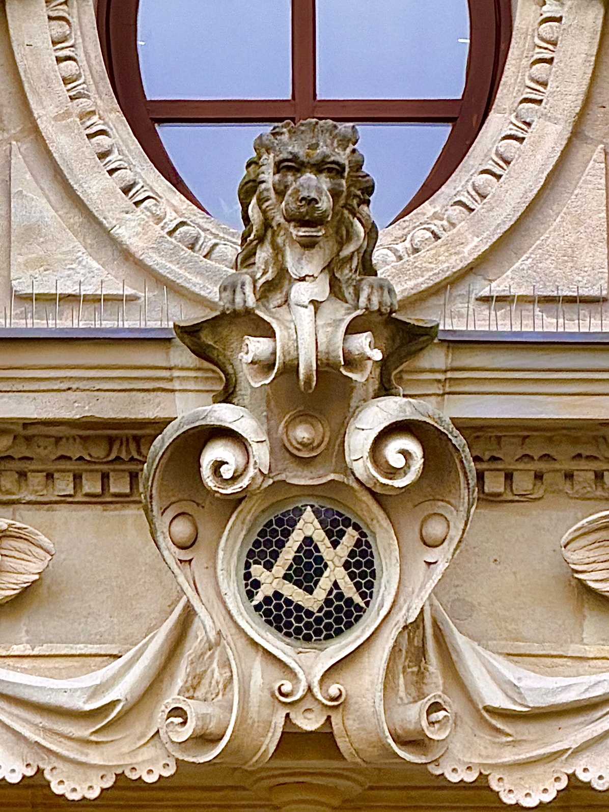 | Dateiinfo (Bild-Unterschrift und Info-Box, automatisch erstellt) | Löwenkopf am Eingansportal des Logenhauses. Urheber: Claus W. Vogl<br><br>Lizenz: CC BY-SA 4.0 | ||