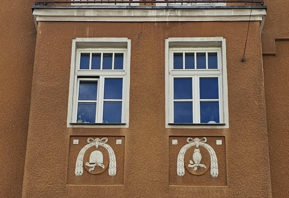 | Beschreibung | Bienenkorb und Eule an der Fassade Simonstraße 62, September 2025 | ||