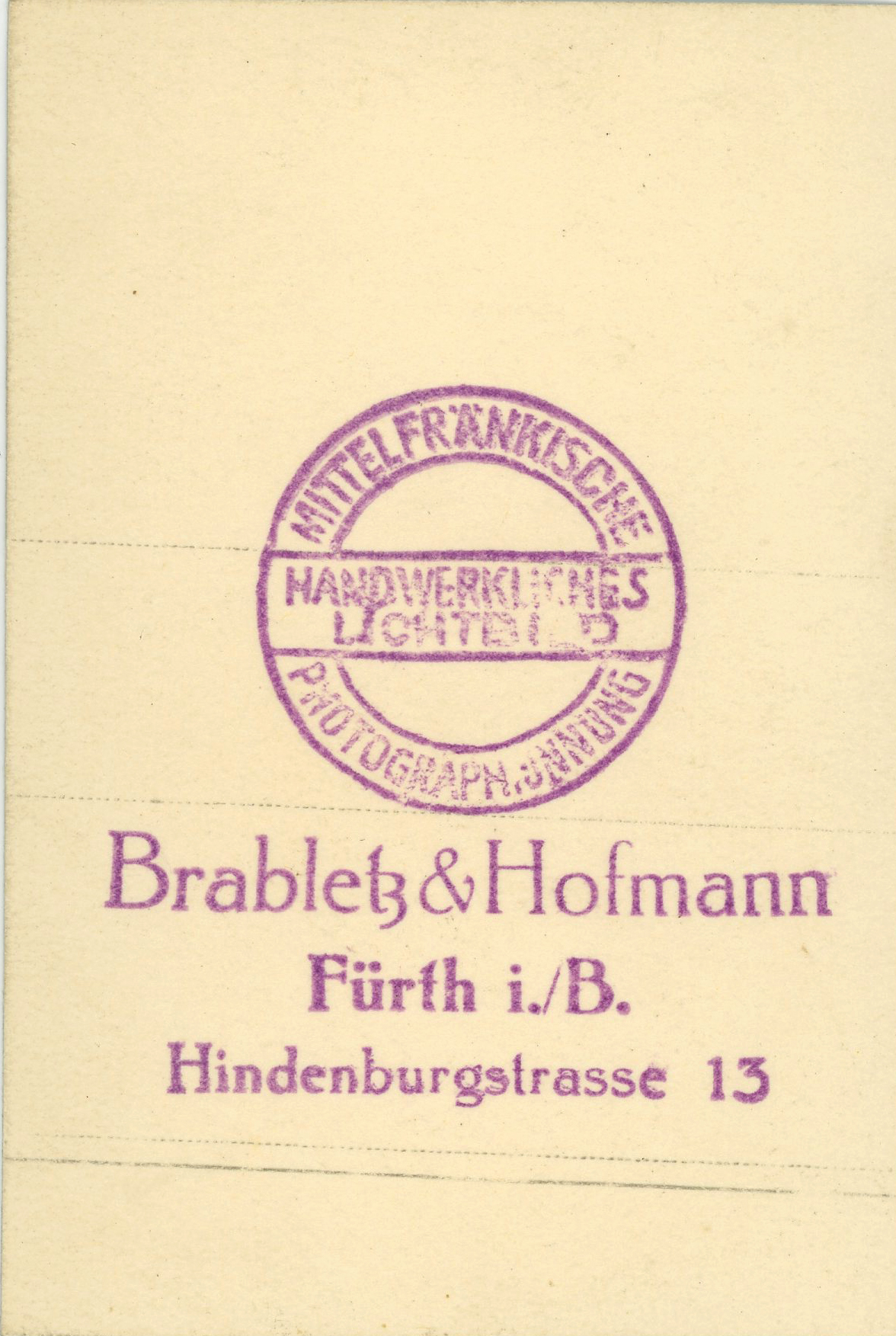 | Beschreibung | Rückseite einer Fotografie aus dem Atelier Brabletz & Hofmann in der Hindenburgstraße 13, ca. 1920 | ||