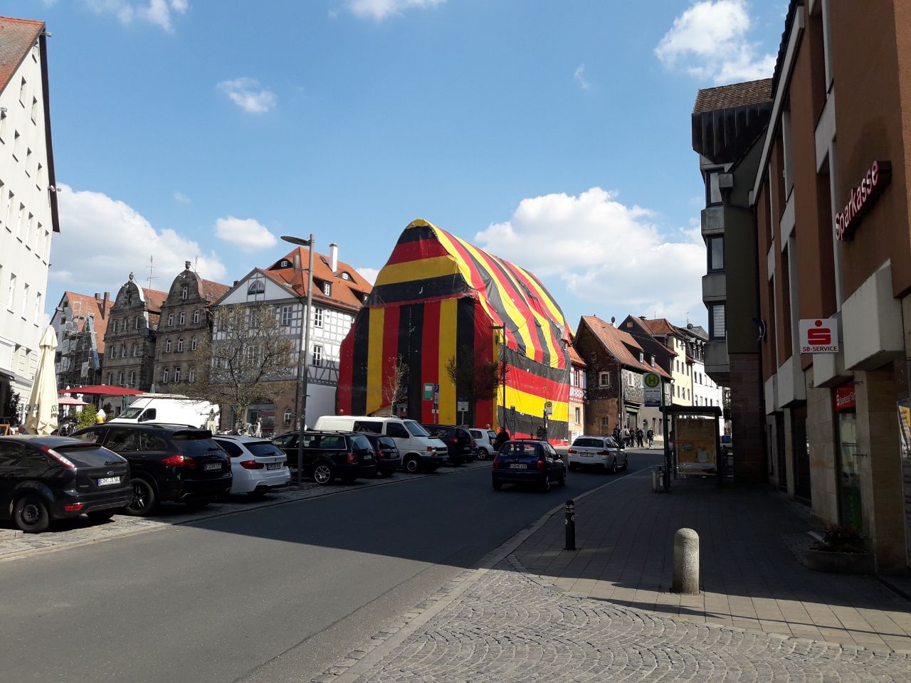 | Beschreibung | Der ehemalige Goldene Schwan unter einer Schutzplane zur Insektenbekämpfung im April 2018 | ||