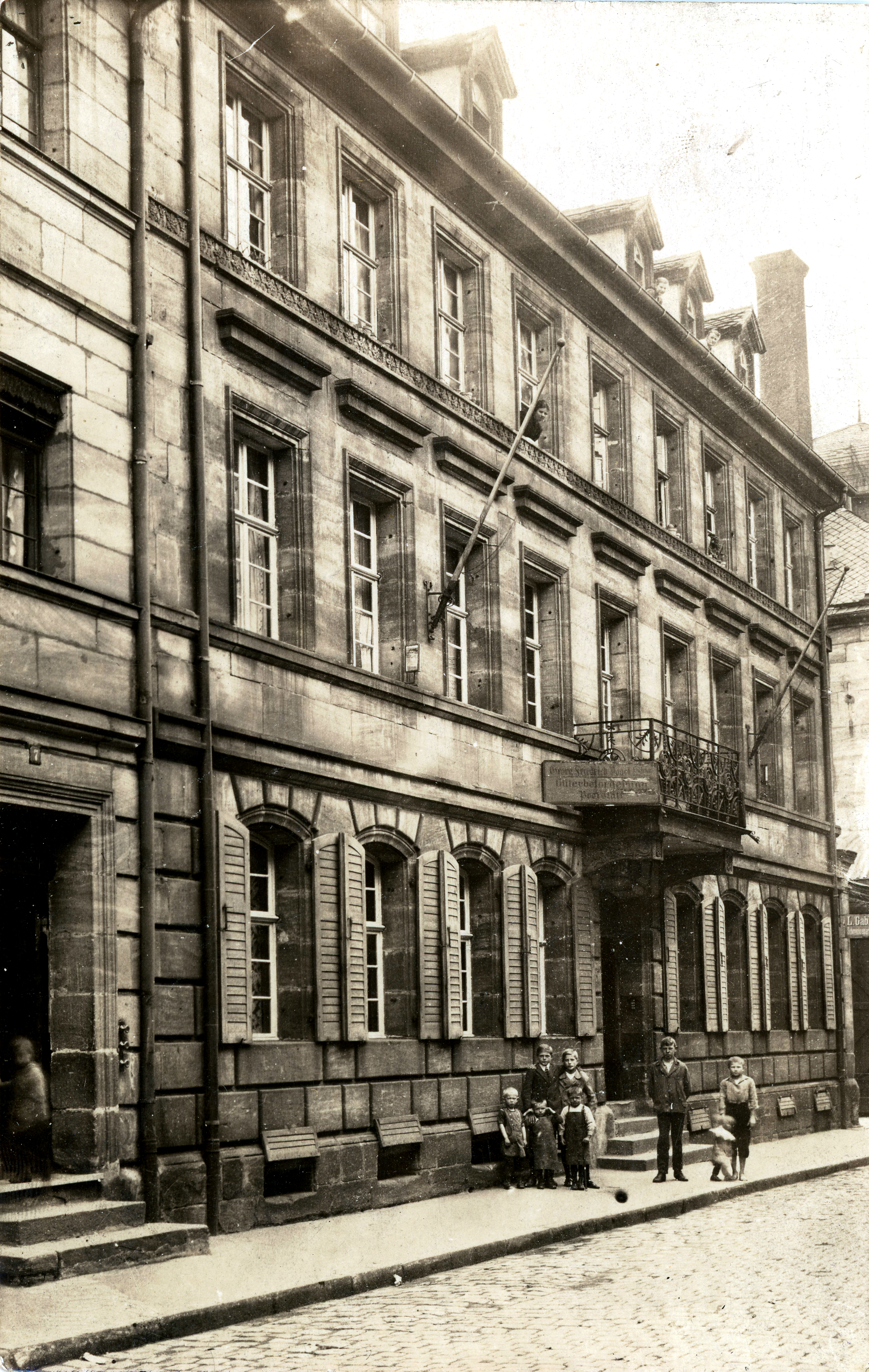 | Beschreibung | Die Lohnkutscherei und Güterbeförderung Georg Friedrich Vogel & Söhne in der Gartenstraße 9, ebenfalls im Gebäude das Fuhrunternehmen M. Stengel, vorm. H. Raschbacher, rechts im Bild Liselotte Gabler, Schmuckreparatur - ca. 1900 | ||