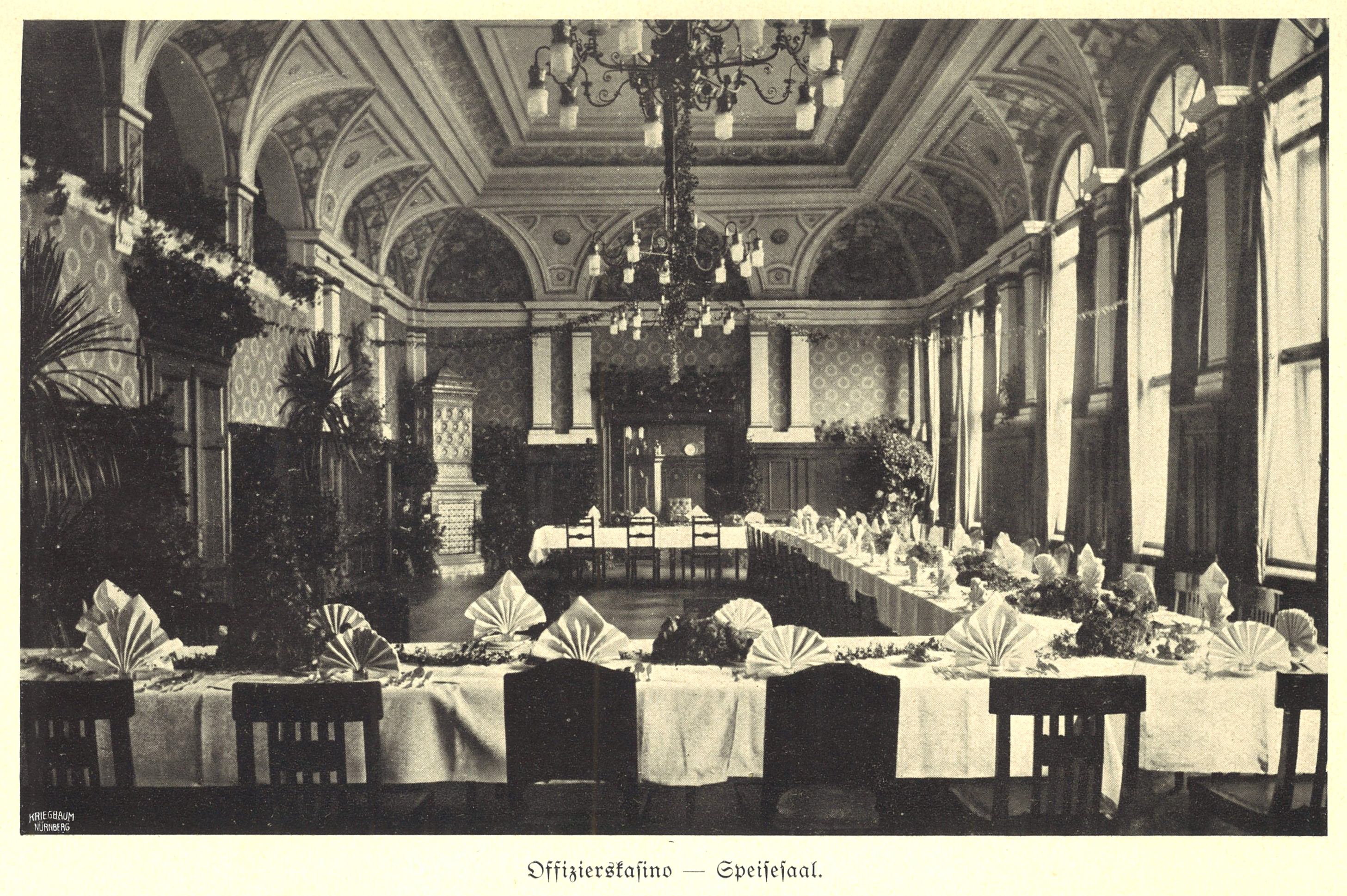 | Beschreibung | Großer Speisesaal bzw. Offizierskasino im 2. Stock des Dienstgebäudes der Artilleriekaserne. Aufnahme um 1910 | ||